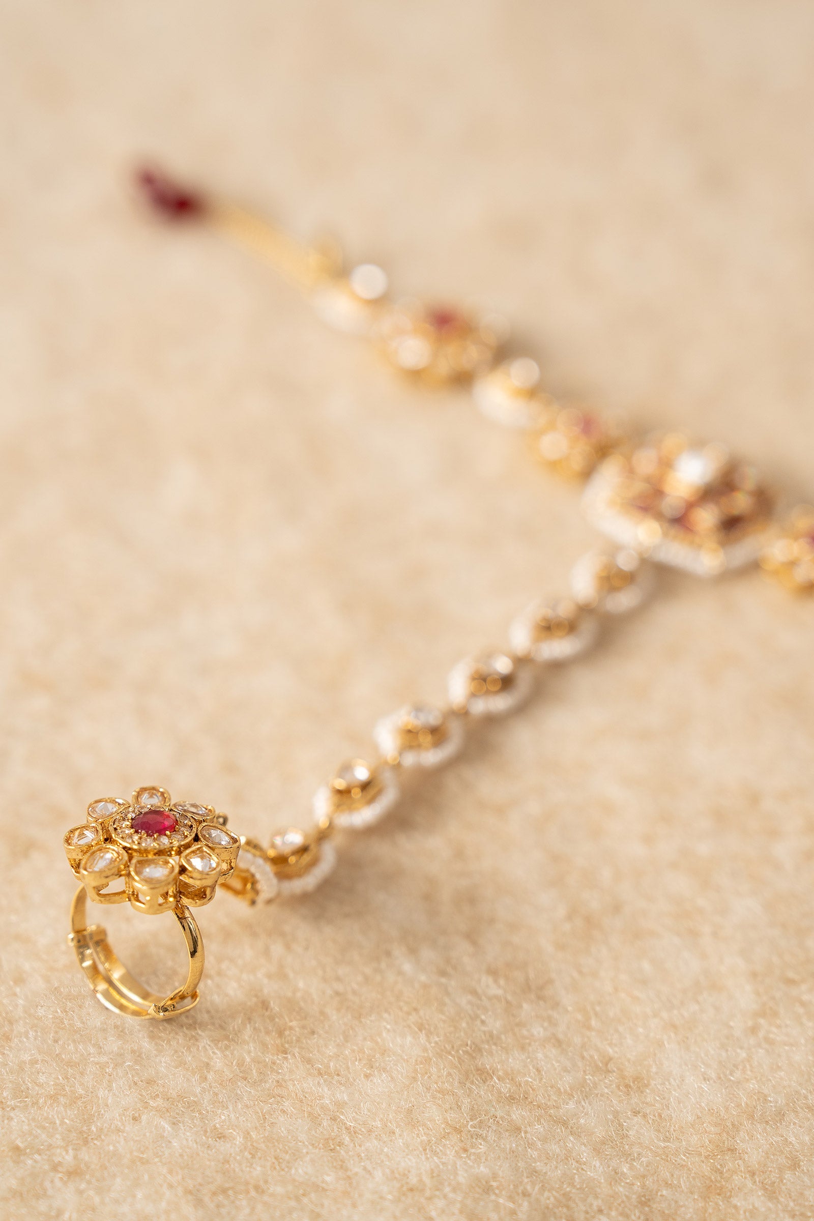 This classic angla with adjustable ring embodies the essence of celebration with the richness of white handcut glass and pink chatham stones encaged with white zircons that beautifies your wrist and finger. Opt for opulence and emulate sheer class.