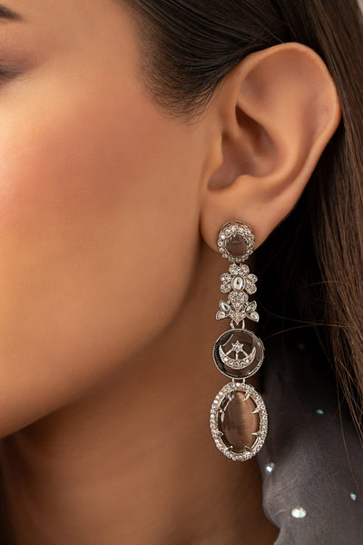 Introducing a unique classic yet contemporary fusion, our chaand Taara Earrings showcase a mesmerizing suffuse of handcut glass stone with grey glass stone, brown cats eye, white zircons, and a chaand taara motif. A statement piece for an effortless elevated look.