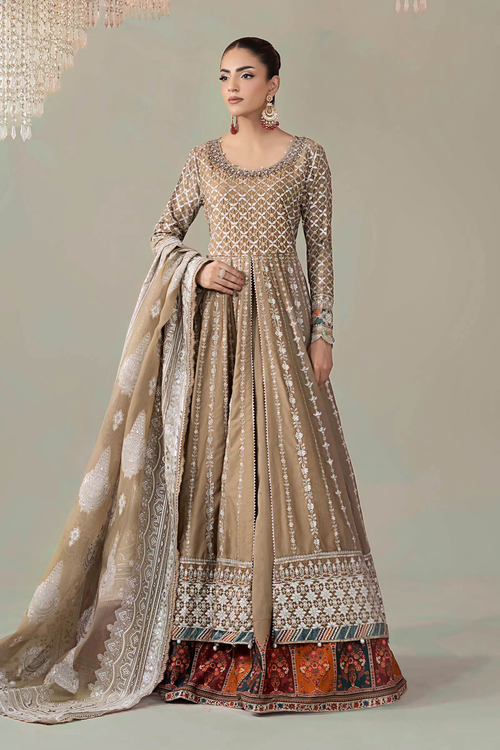 FrockEmbroidered Hand-Embellished NecklineDyed Embroidered FrontEmbroidered SleevesDyed BackFabric: Cotton SatinColor: BeigeSkirtDyed SkirtElasticated WaistbandPrinted BorderFabric: Cotton SatinColor: BeigeDupattaFoil Printed DupattaFabric: Burnout Organza Color: BeigeWork Details: Sequins, Tilla & Thread EmbroideryModel is wearing size xsNote: Dry Clean Only