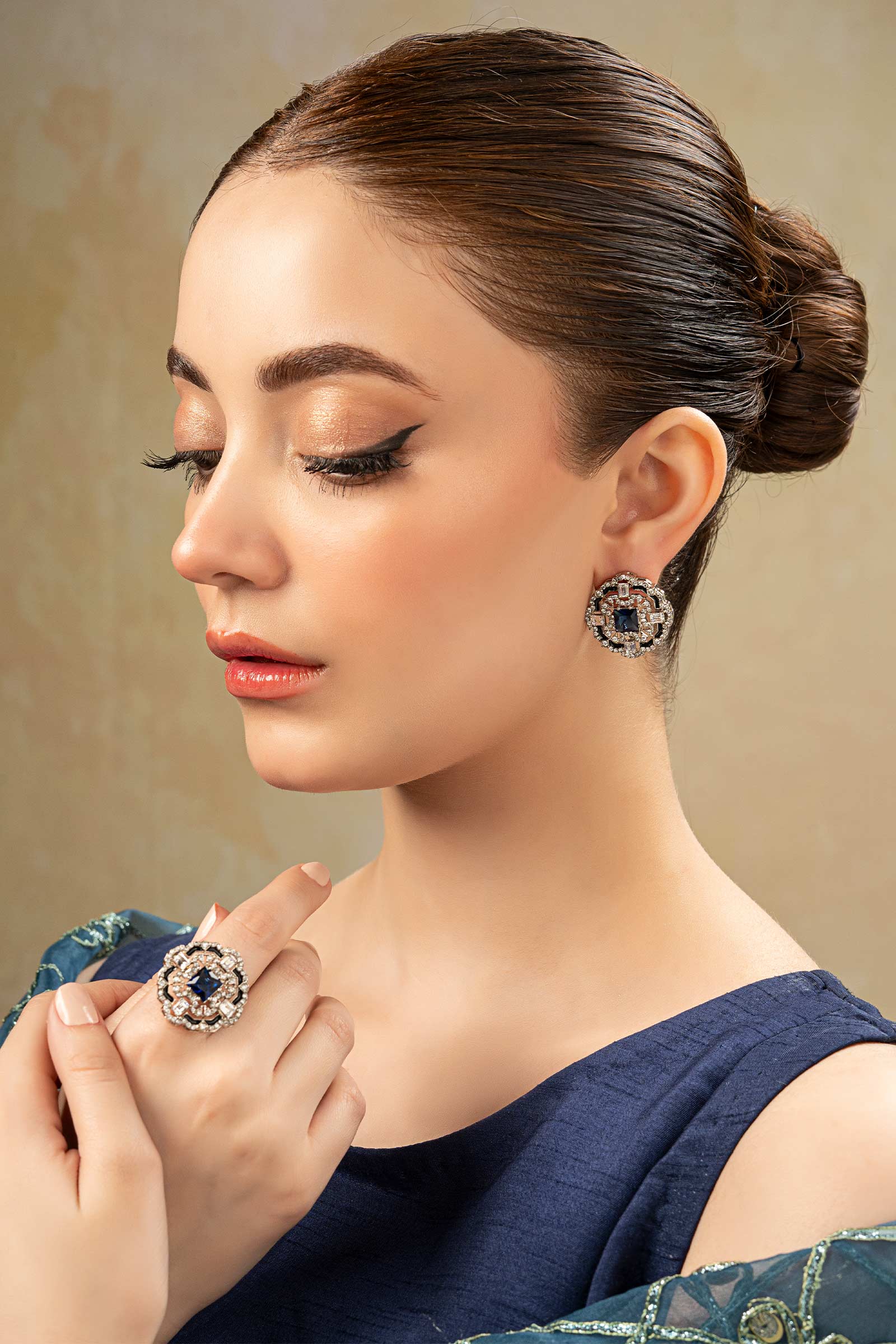 Adding sparkle to your festivities with our Cubic Ring - Showcasing intricate vintage artistry embellished with white zircons imbued with black enamel. For an elevated style, it is finished with sapphire blue glass stone in the center that attracts all eyes. Finish: Silver Product Care: Wipe Clean