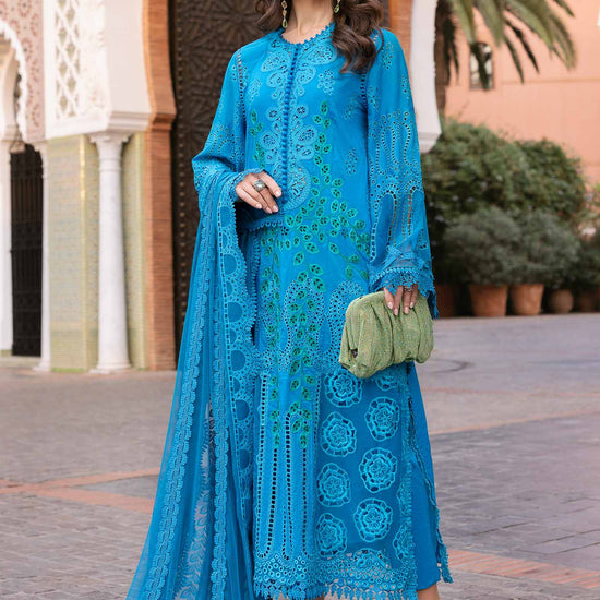 ShirtEmbroidered Organza Neck PatchEmbroidered Lawn Center PanelEmbroidered Lawn Side Panel RightEmbroidered Lawn Side Panel LeftEmbroidered Organza Side Panel PatchEmbroidered Organza Ghera PattiEmbroidered Lawn SleevesDyed Lawn BackFabric: LawnColor: FeroziTrousersDyed TrouserFabric: CambricColor: FeroziDupattaDyed Paste Printed DupattaEmbroidered Organza Dupatta Side PattiEmbroidered Organza Dupatta Pallu PattiFabric: NetColor: FeroziNote: Dry Clean Only