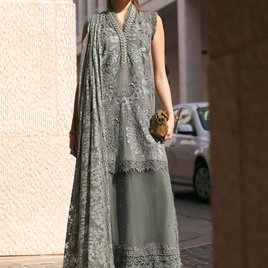 Color: Dusty Blue & Dusty GreenShirtEmbellished Neck Patti With Pearls & Beads Embroidered Lawn Karandi Centre Panels R+L With Lawn Applique, 3D Flowers & PearlsEmbroidered Lawn Karandi Side Panels R+LEmbroidered Organza Ghera PattiEmbroidered Lawn Karandi Sleeves R+L With 3D Flowers & PearlsEmbroidered Organza Sleeves PattiDyed Lawn Karandi BackUndershirtDyed Lawn UndershirtTrouserDyed Arabic Lawn TrouserEmbroidered Organza Trouser PatchesDupattaDyed Chantilly DupattaNote: Dry Clean Only