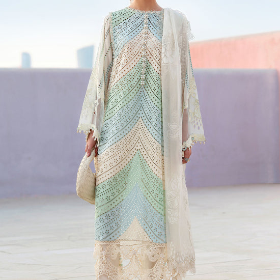 Color: Sky BlueShirtPearl Lace For NeckEmbroidered Lawn Centre PanelDyed Lawn Side Panels L+REmbroidered Organza Sleeves Patches With 3D FlowersEmbroidered Lawn SleevesPrinted Lawn BackDyed Lawn Front LiningTrouserDyed Cambric TrouserDupattaDyed Burnout Organza DupattaNote: Dry Clean Only