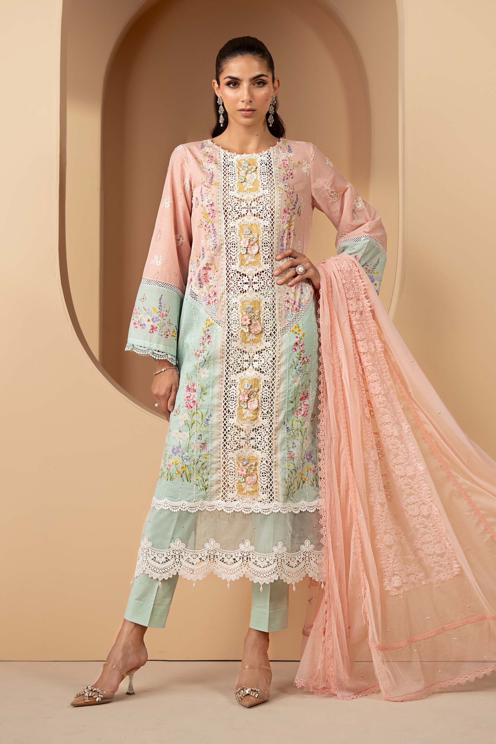 Color: Pink & AquaShirtPrinted Shirt With Embroidery, 3D Flowers & Stickon Pearls DetailingRound Neckline With Pearls DetailingOrganza Embroidered Scalloped BorderPrinted Sleeves With Embroidery, Stickon Pearls Detailing & Scalloped FinishPearl Drop Hanging On Sleeves & BorderFabric: LawnTrouserDyed Straight-Leg TrouserElasticated WaistbandFabric: CambricDupattaEmbroidered Dupatta With Pearls DetailingDyed Chantilly Centre PanelFour-Side Lace BorderFabric: NetNote: Dry Clean Only