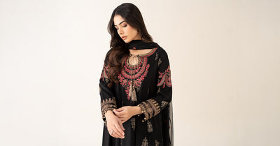 Embroidered neckline, embroidered ghera border and embroidered sleeves border