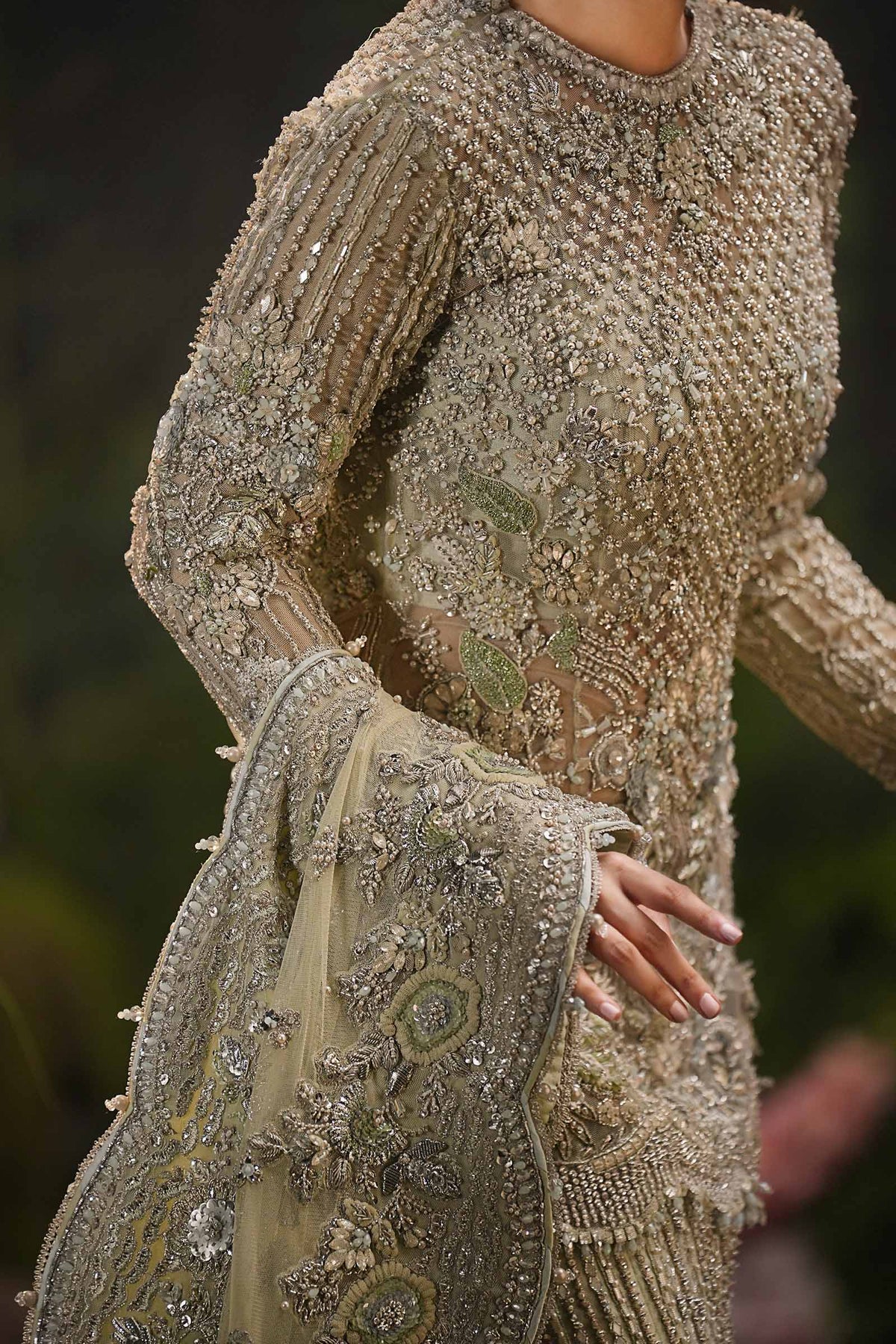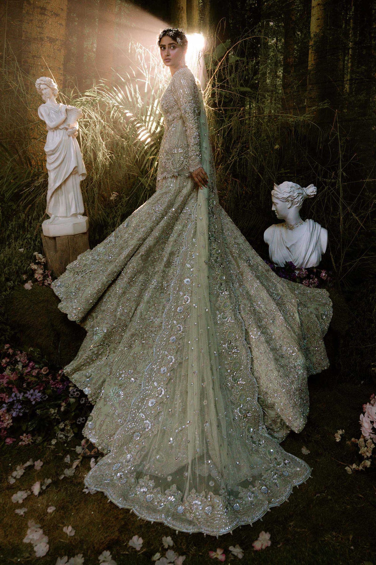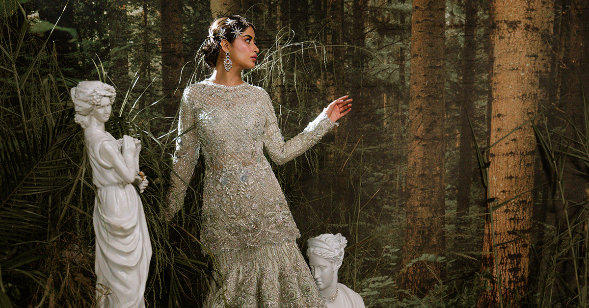 A masterpiece of bridal opulence, this mermaid Lehenga Set embodies the splendor of a royal muse. Crafted with strings of pearls and mirrors that shimmer like liquid light, it is adorned with sequins, aqua fringes, colored threadwork, and crystal embellishments, each detail a testament to timeless artistry. The dupatta, edged with scalloped borders and crystal-sprayed motifs, flows in satin-finished elegance. Designed for her grand day with delicate embellishments of glistening sequins parls, it captures the essence of regal romance and the grace of a bride destined to reign in beauty.
