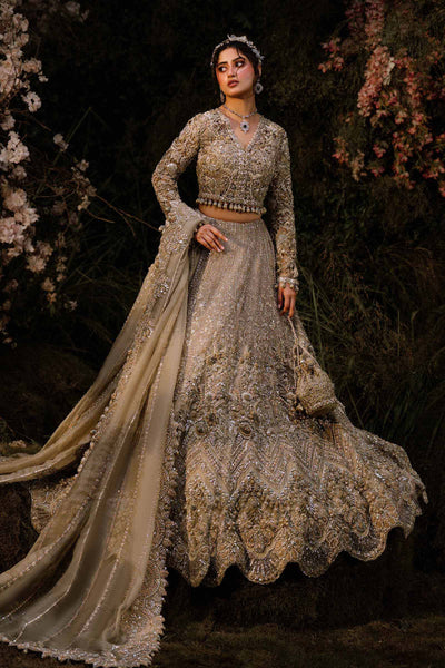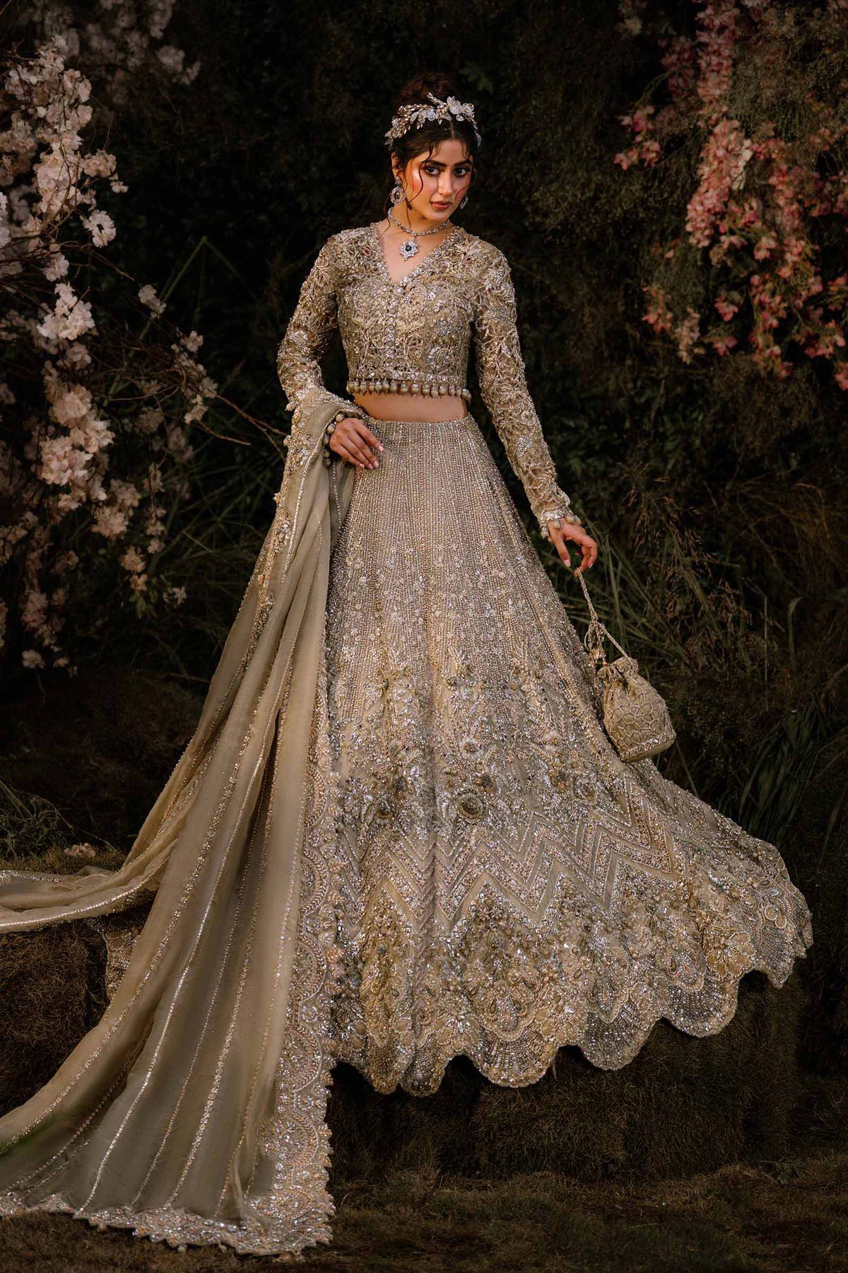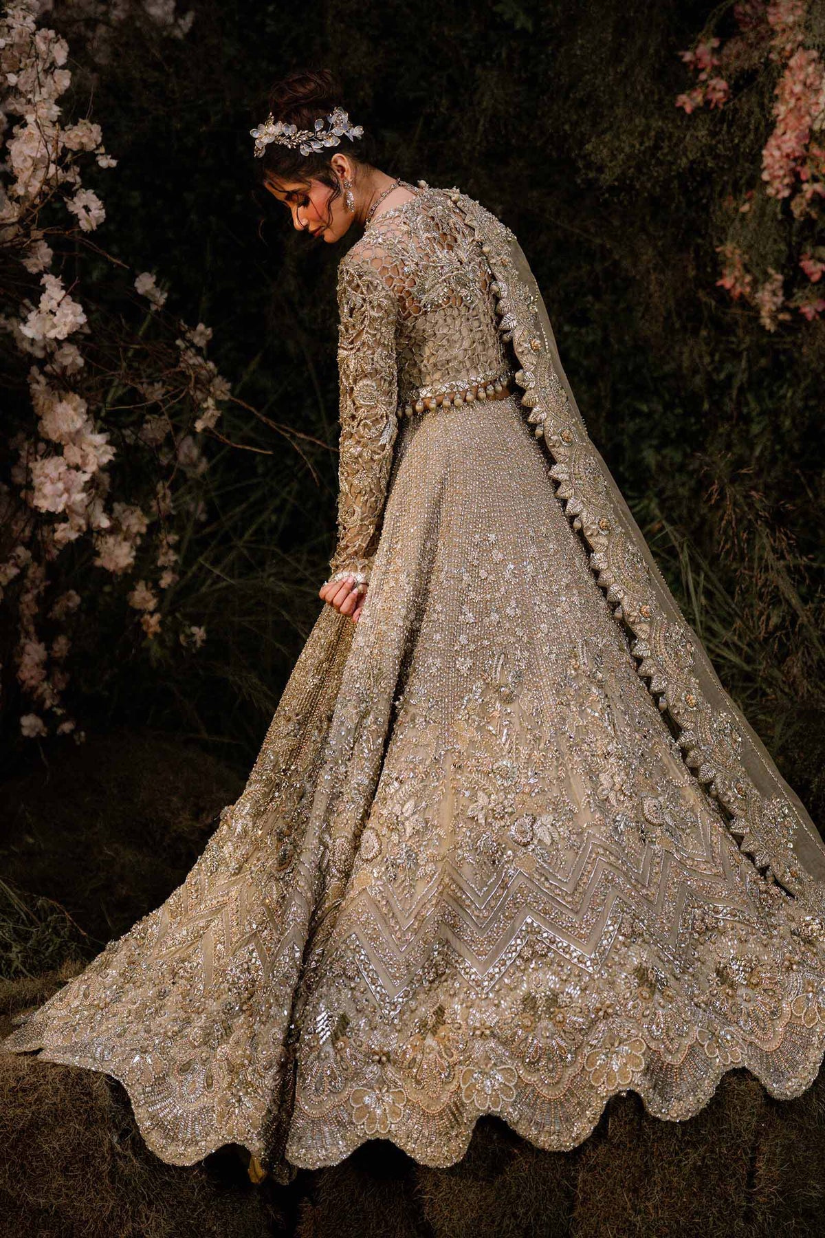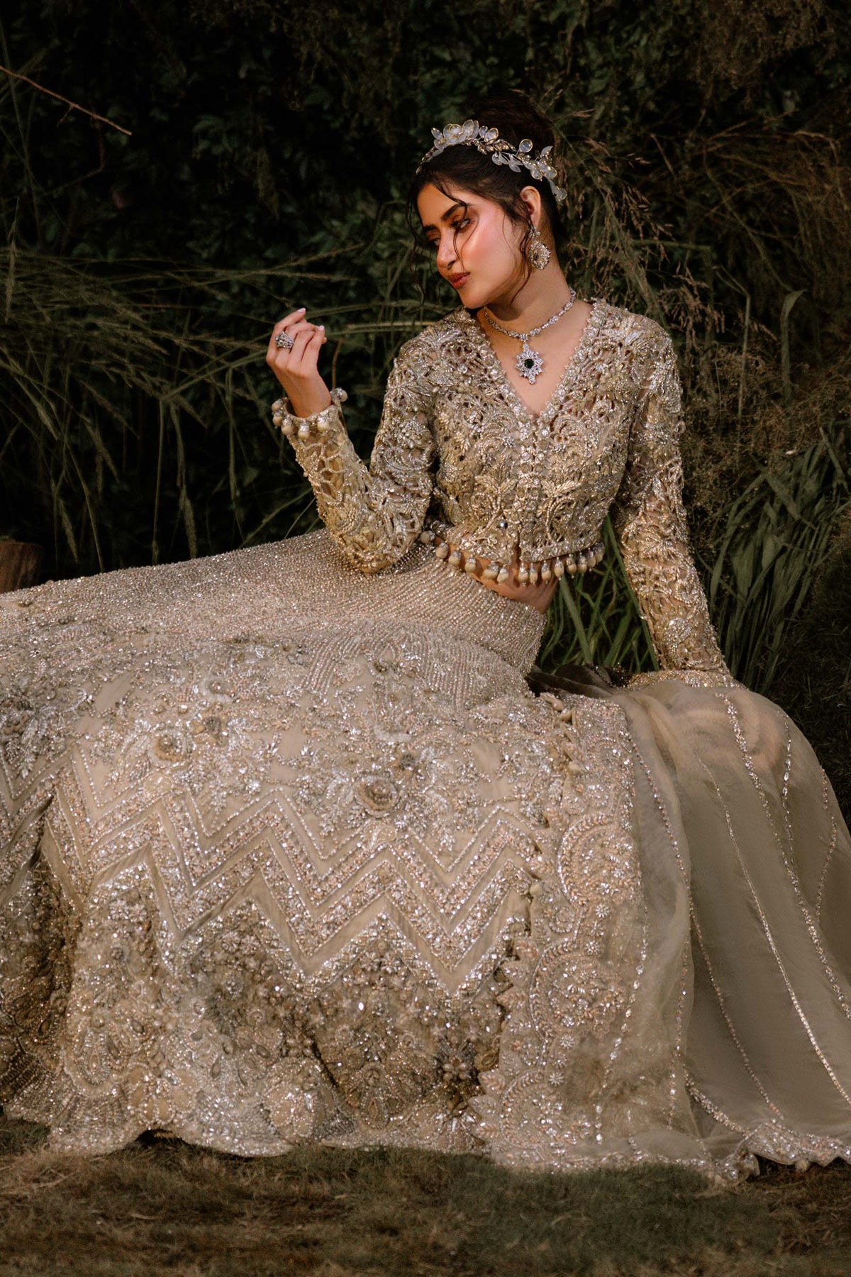 A timeless radiance in this ethereal gold /ivory Lehenga Set, a canvas where craft and couture entwine. Sculpted with 3D florals that bloom in light, kissed by pearls and glimmering gotta, it glows with an understated opulence. The intricate play of dabka, nakshi, and diamanté embroidery evokes timeless artistry, making it a masterpiece for the bride who dreams in elegance, yet moves through modernity with grace.