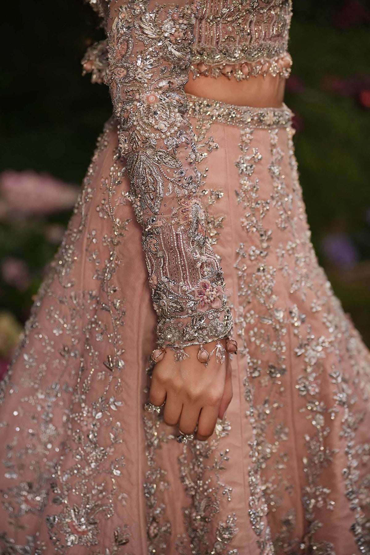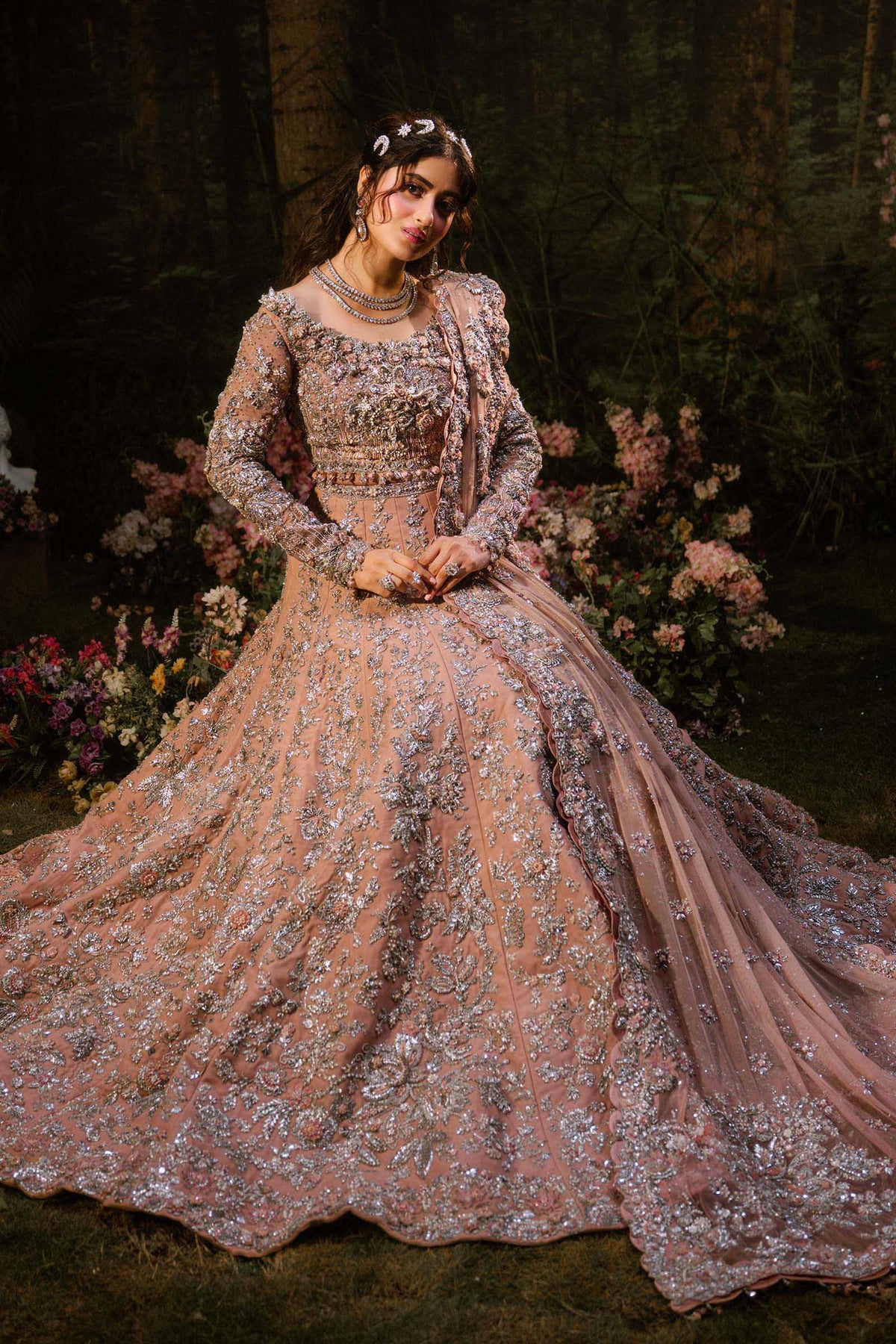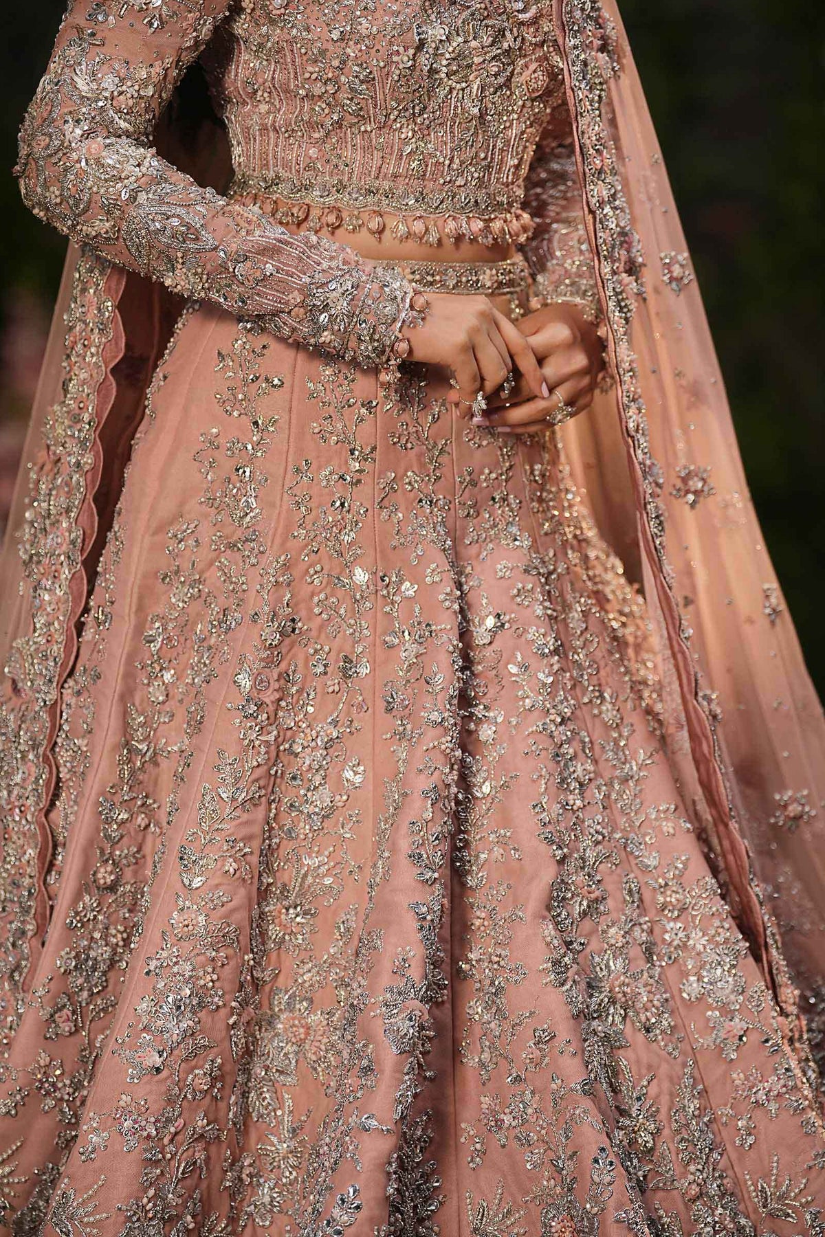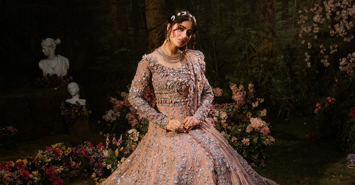 A vision of timeless grace, this powder-peach Lehenga Set captures the essence of modern romance steeped in tradition. Adorned with intricate 3D gotta work, pearls, and exquisite dabka-nakshi embellishments, it radiates soft luminosity and regal charm. The ensemble is completed with a delicately crafted schiffli-embroidered dupatta (optional), dusted with diamanté accents that shimmer like whispers of light, adding extra ethereal touch to the bride who embodies both classic allure and contemporary poise.