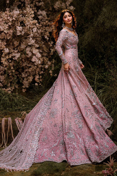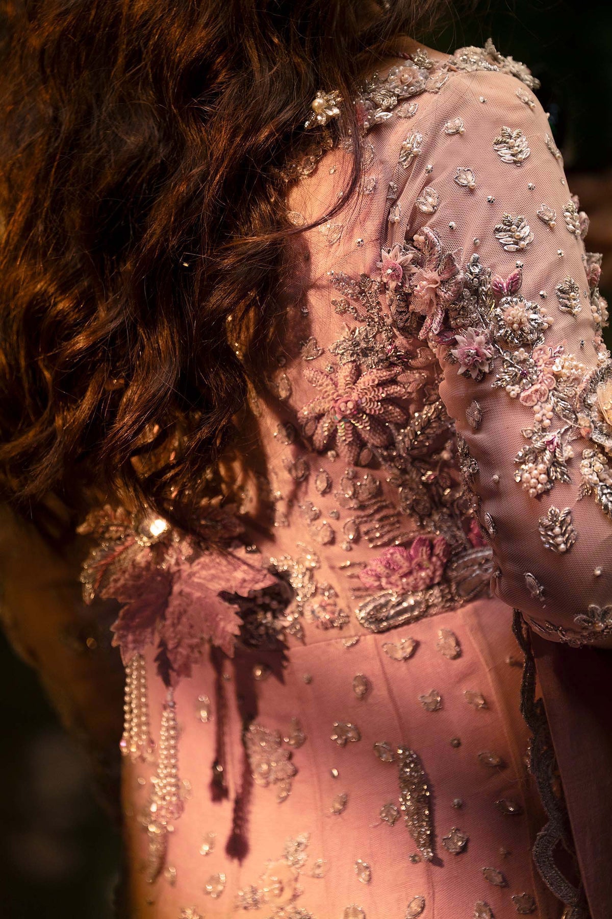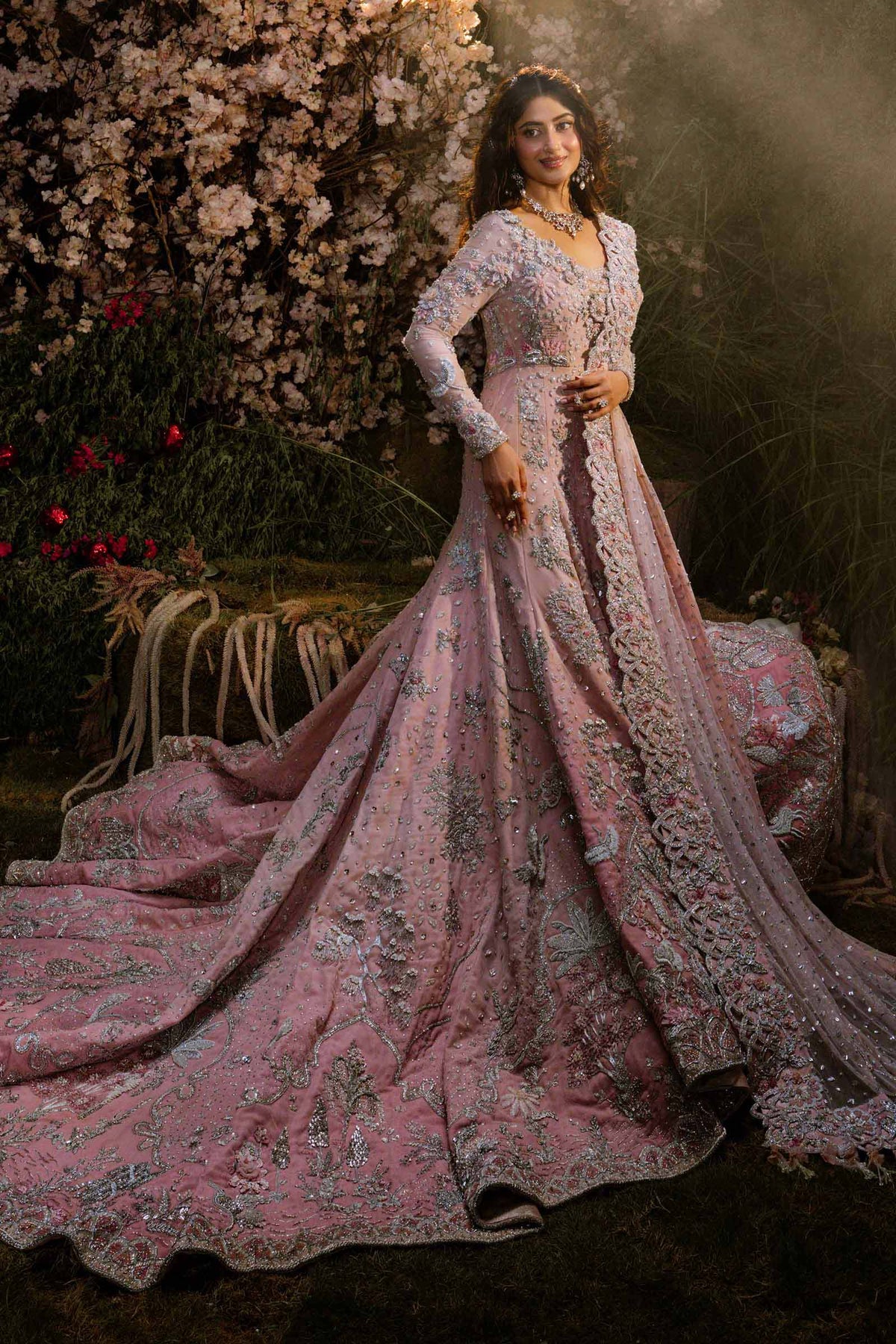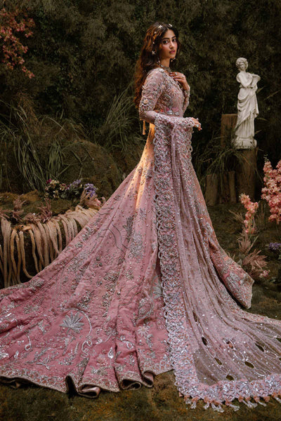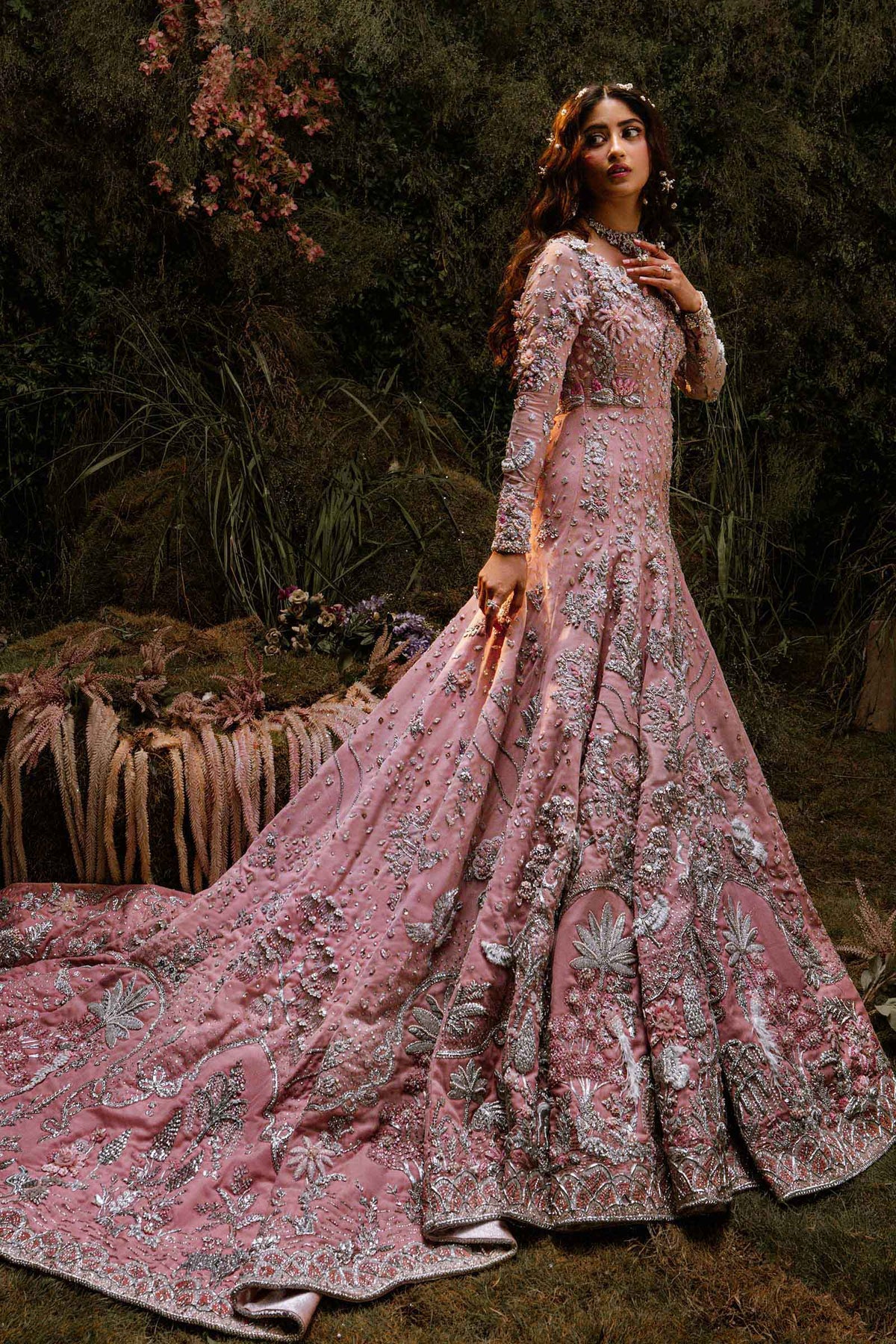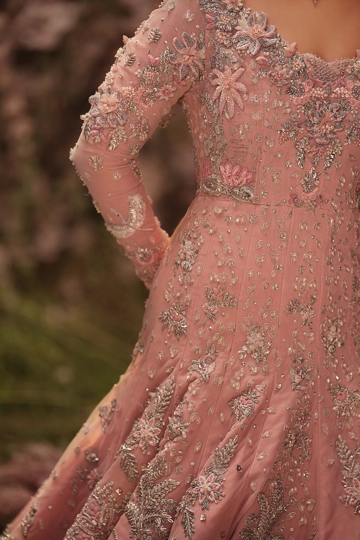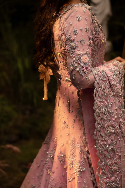 A fairytale spun in pink ombré; this bridal Gown Set is a poetic ode to timeless craftsmanship and divine artistry. The long-tail gown unfurls like a Persian tale, where intricate 3D floral elements bloom alongside hand-rendered motifs of birds and trees, each whispering stories of love and legacy. Embellished with delicate gotta, radiant dabka-nakshi, and gleaming pearls, every detail captures light like a dream in motion. It is a masterpiece for the modern bride who wears heritage as her halo and grace as her signature, it is paired with an (optional) long pink net veil dupatta woven with 3D florets and diamantes for an everlasting look.