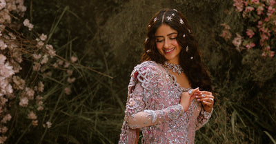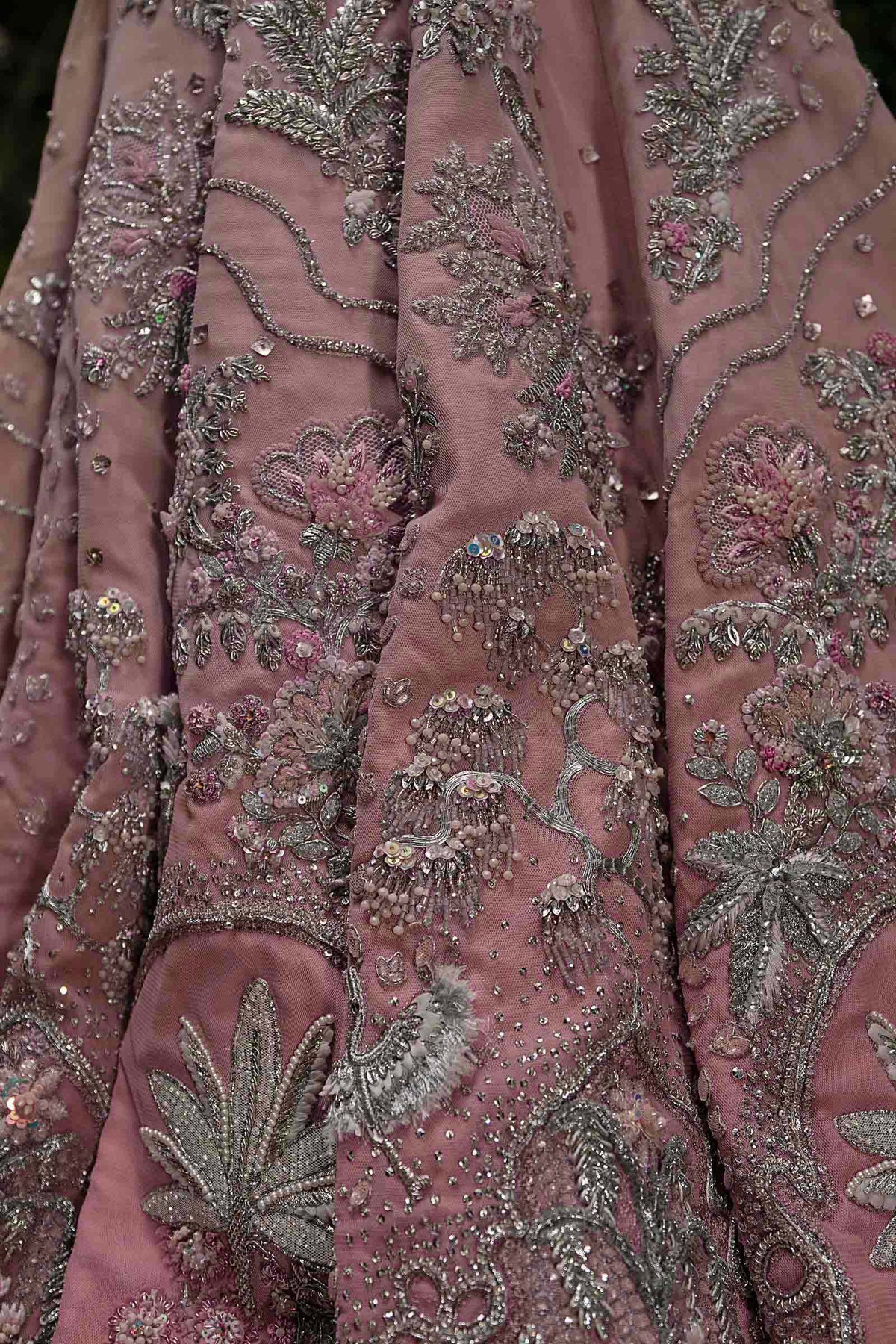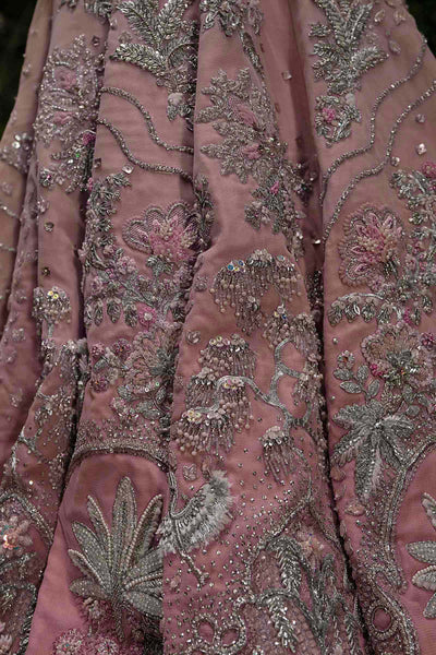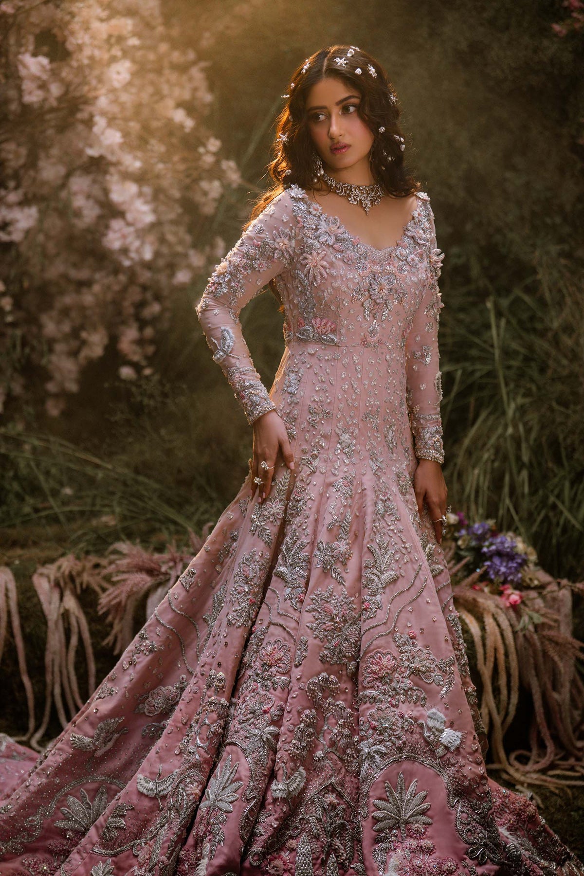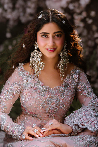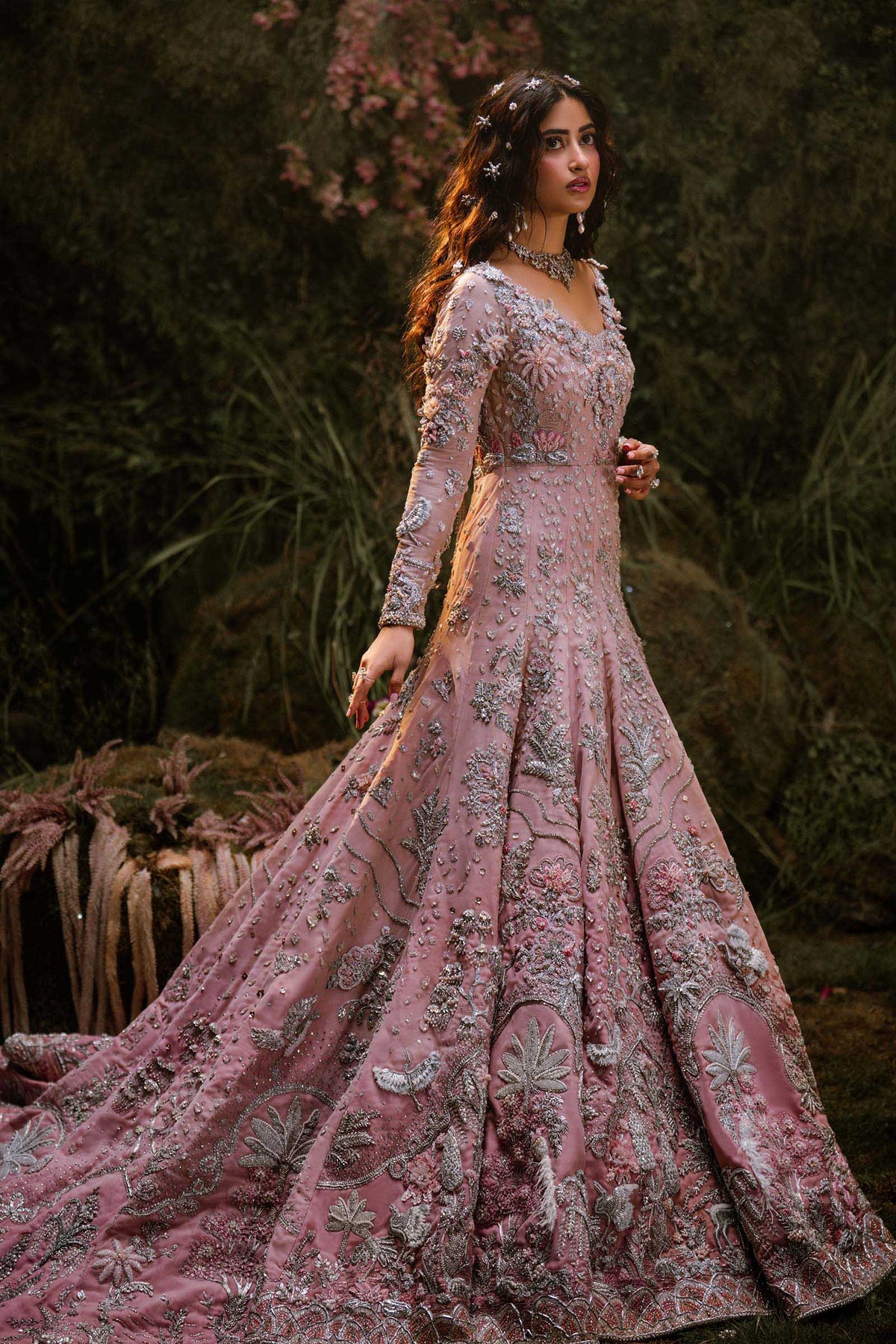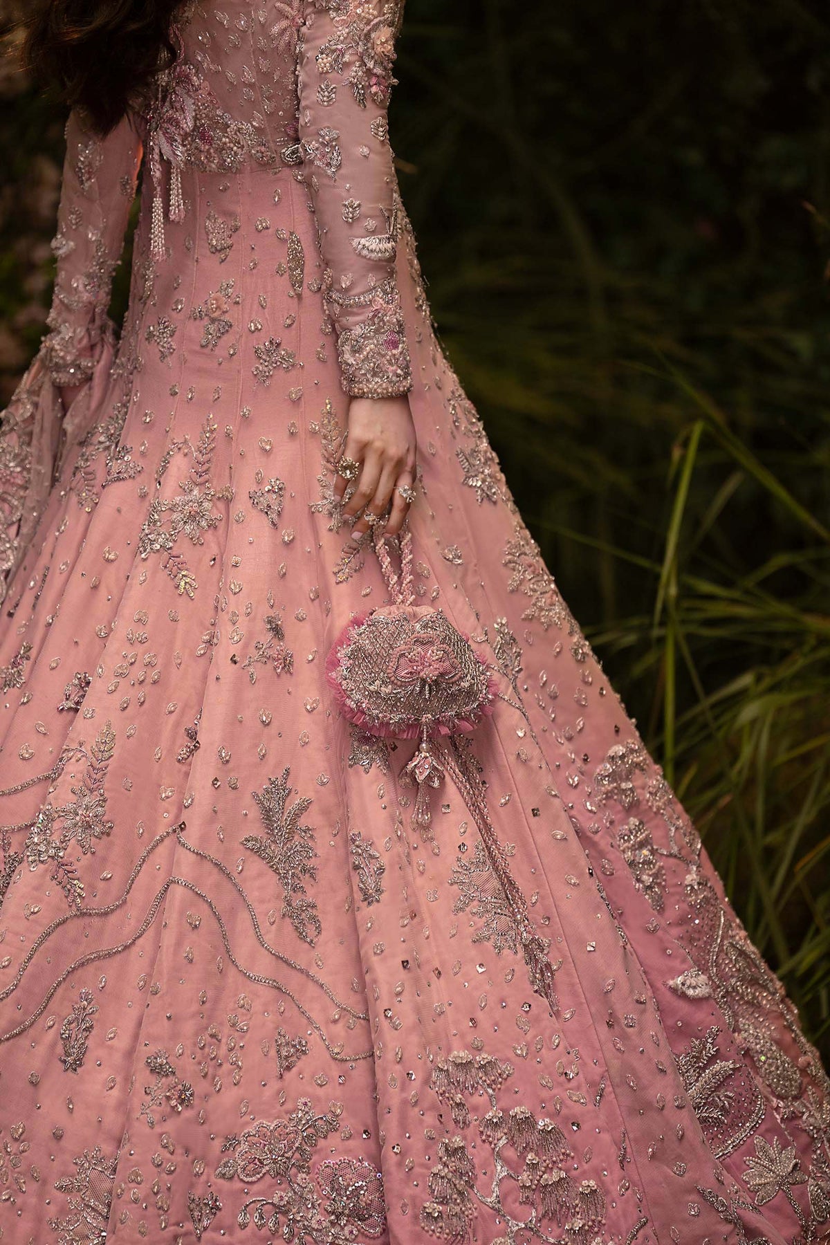 A fairytale spun in pink ombré; this bridal Gown Set is a poetic ode to timeless craftsmanship and divine artistry. The long-tail gown unfurls like a Persian tale, where intricate 3D floral elements bloom alongside hand-rendered motifs of birds and trees, each whispering stories of love and legacy. Embellished with delicate gotta, radiant dabka-nakshi, and gleaming pearls, every detail captures light like a dream in motion. It is a masterpiece for the modern bride who wears heritage as her halo and grace as her signature, it is paired with an (optional) long pink net veil dupatta woven with 3D florets and diamantes for an everlasting look.