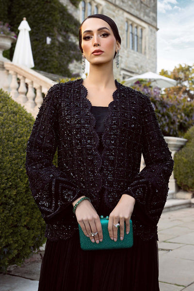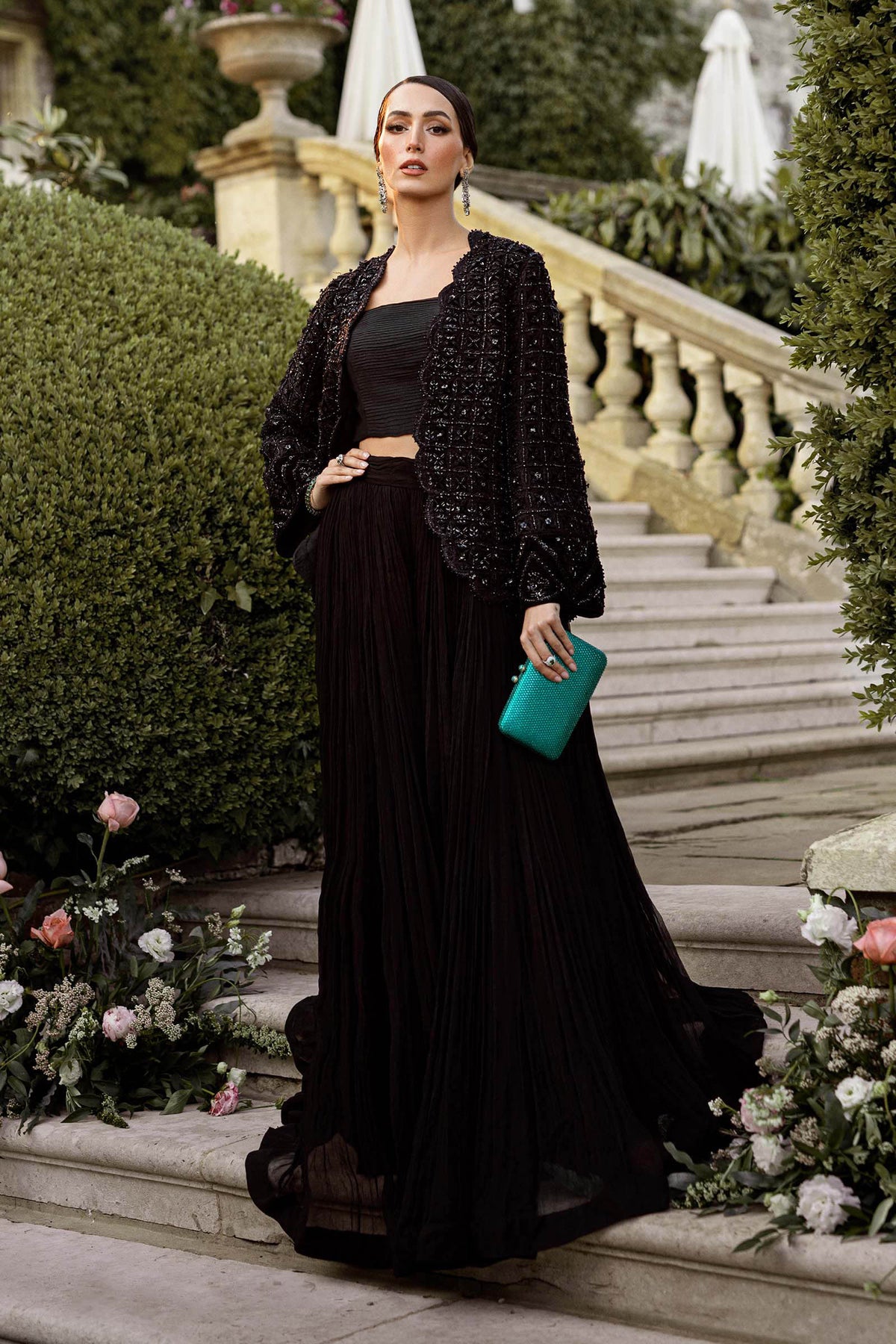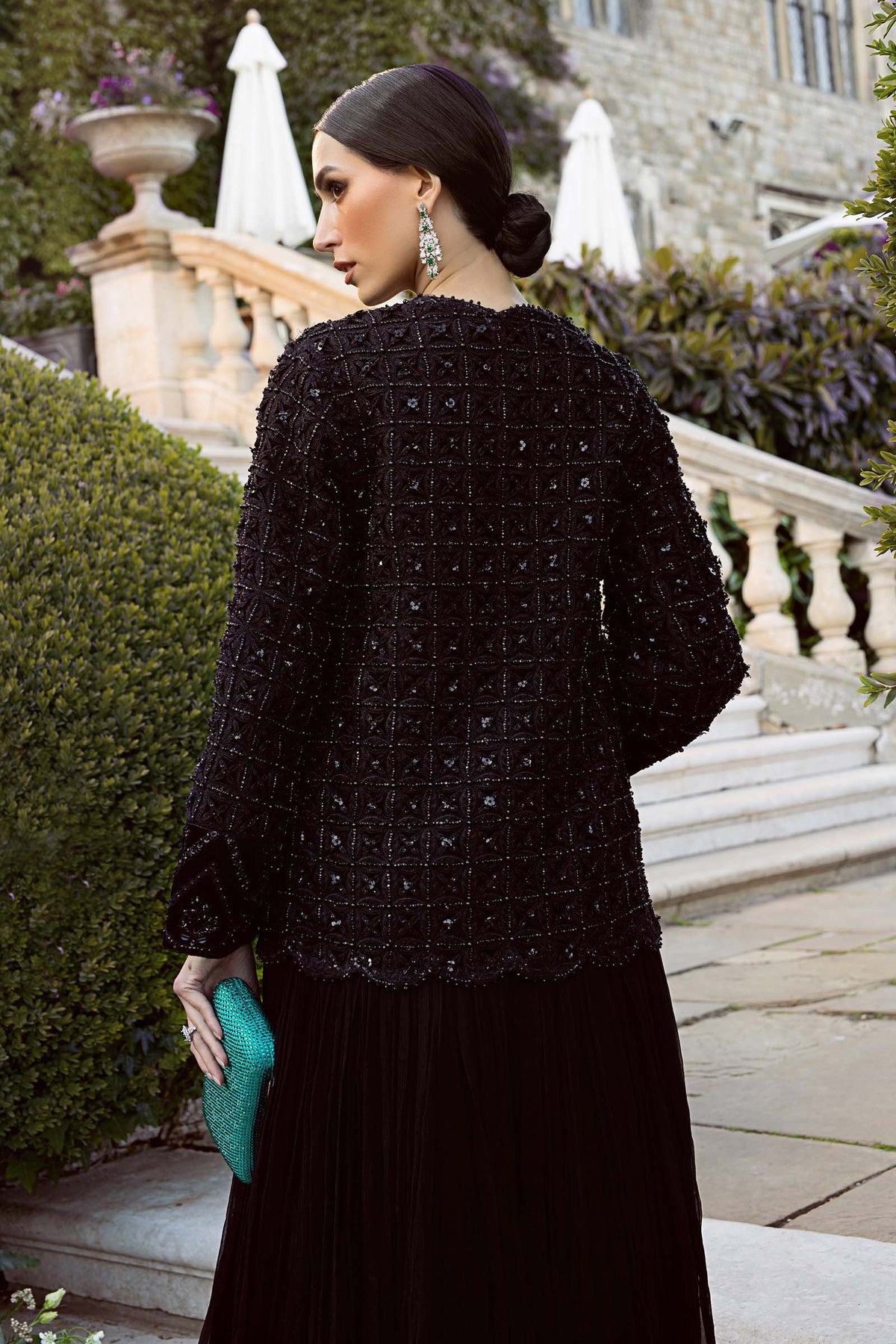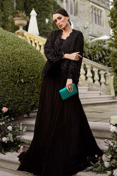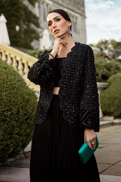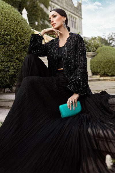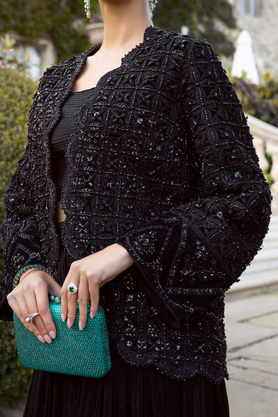 Introducing 'Velvra' jacket sharara set, a symphony of exotic beauty adorned with intricate velvet patchwork woven with lustrous crystals and glistening beads, crafting a masterpiece of artistry. It is completed with flared crushed sharara, making it a vision of loveliness that radiates poise and allure.