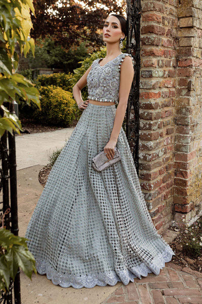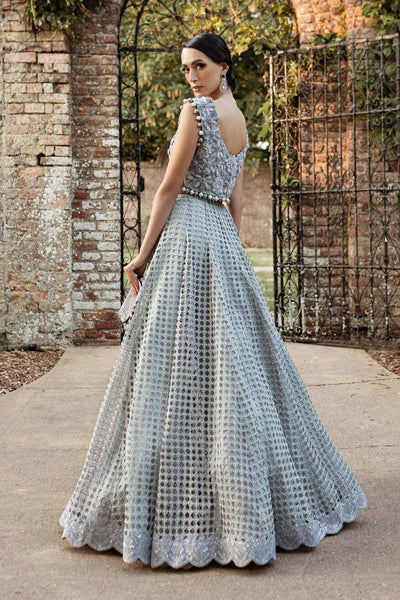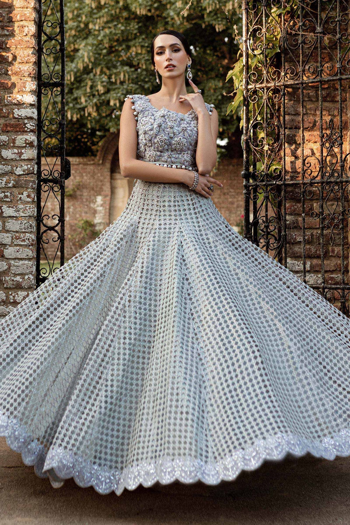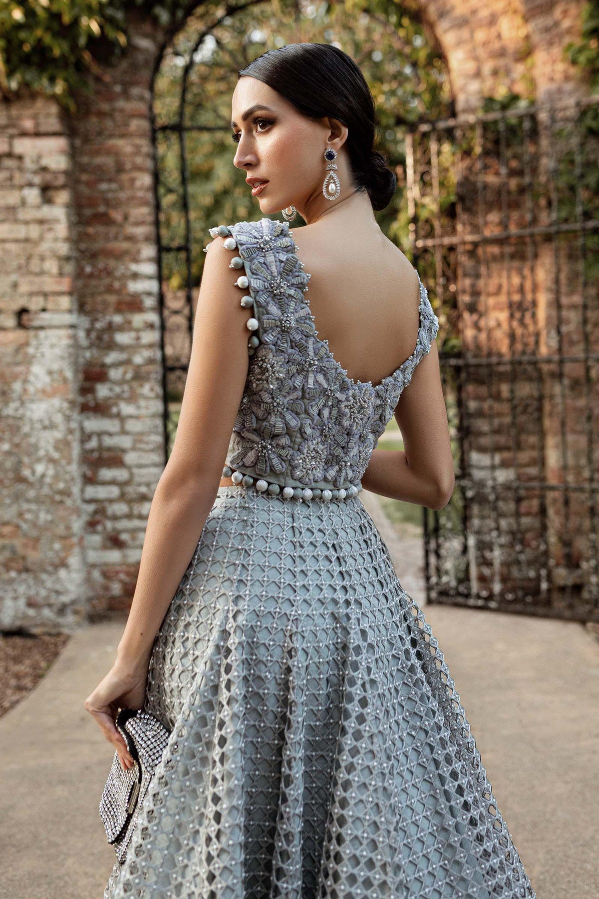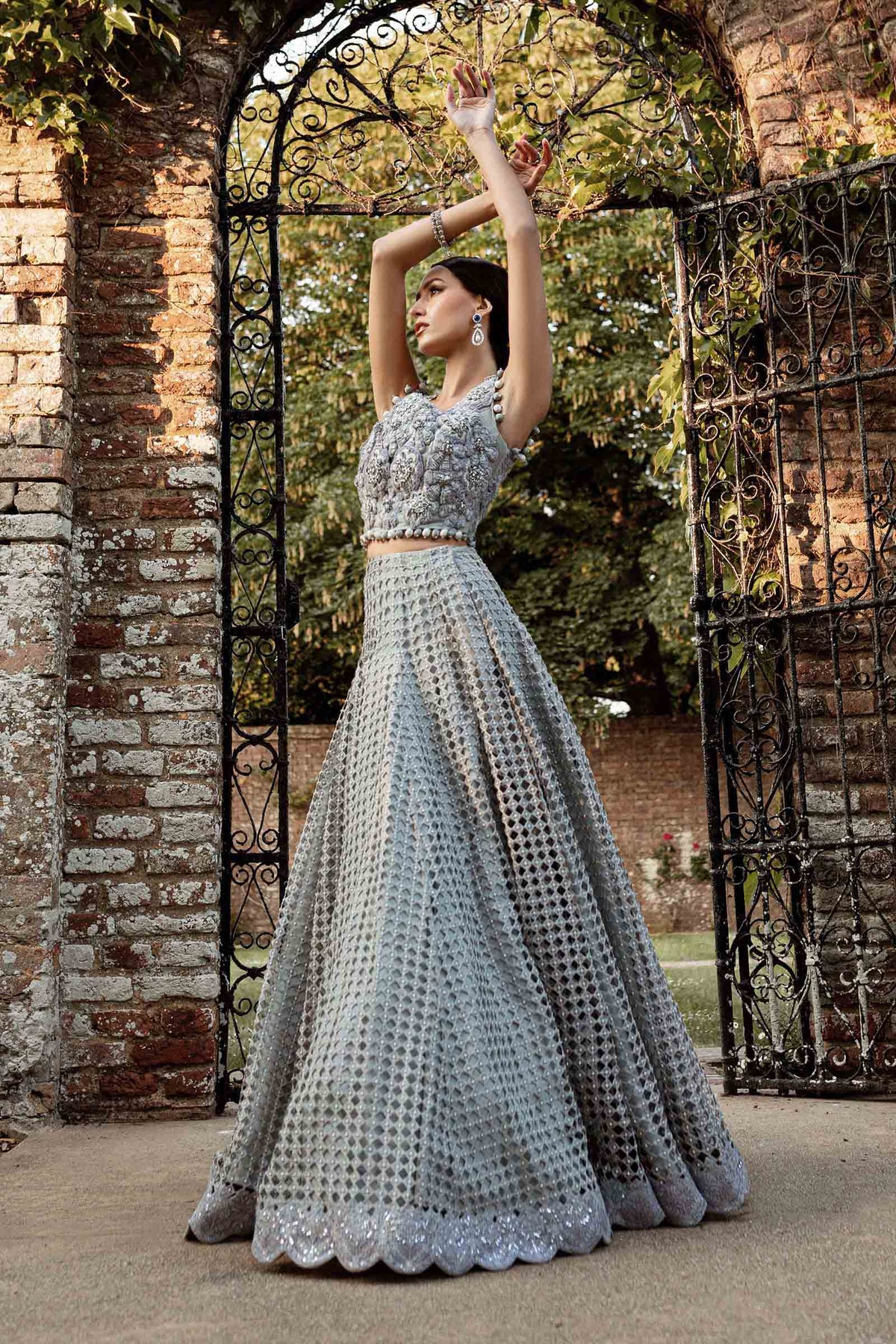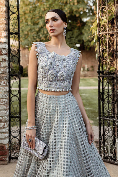 A true showstopper, this couture set features a 3D ribbon and organza lace blouse, intricately encrusted with crystals and beads. Paired with a diaphanous lehenga adorned with thousands of hand-set mother-of-pearls cascading over soft organza, the ensemble flows with sculptural grace — perfect for a statuesque, ethereal festive look with a modern edge.