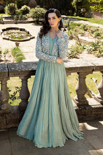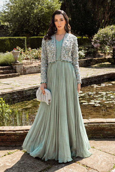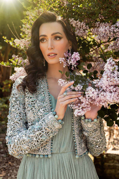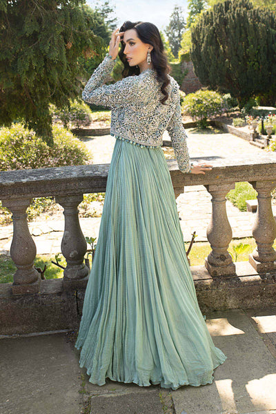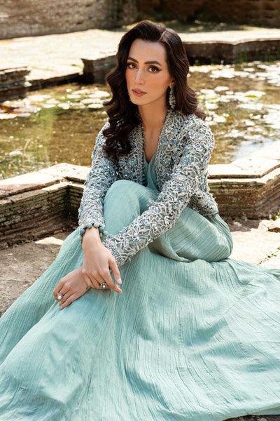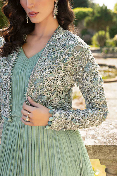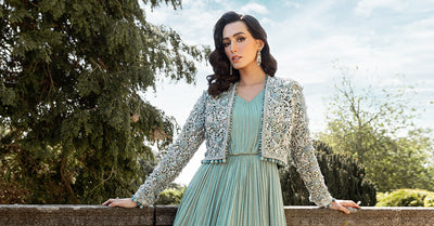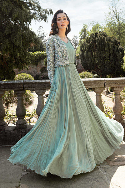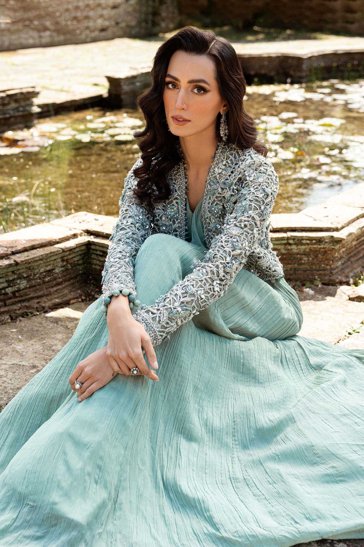 Elanissa' - A vision of refined elegance that unfolds tranquility mint green hues. The crushed flares of long gown whispers tales of royal elegance. Layered under lustrous crystal, glistenning beads, shimmering sequins, heavenly pearls and classic cutdana work, it weaves a narrative of timeless artistry. It is a definitive statement of sophistication, destined to leave a lasting impression at any festive occasion.