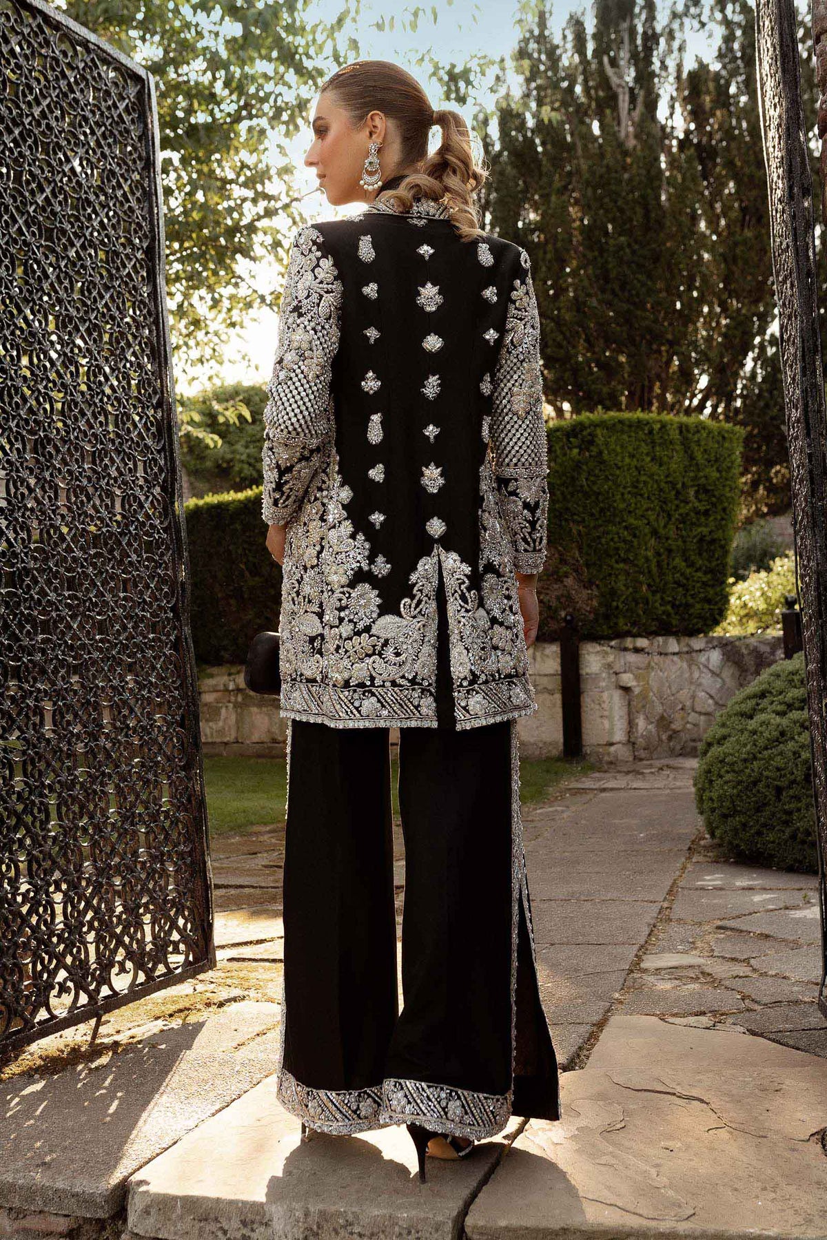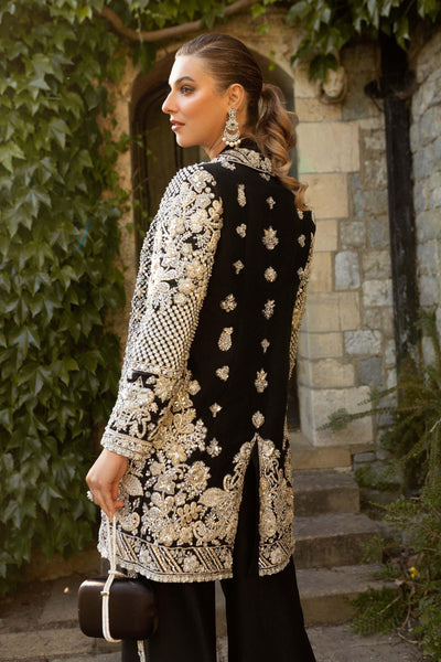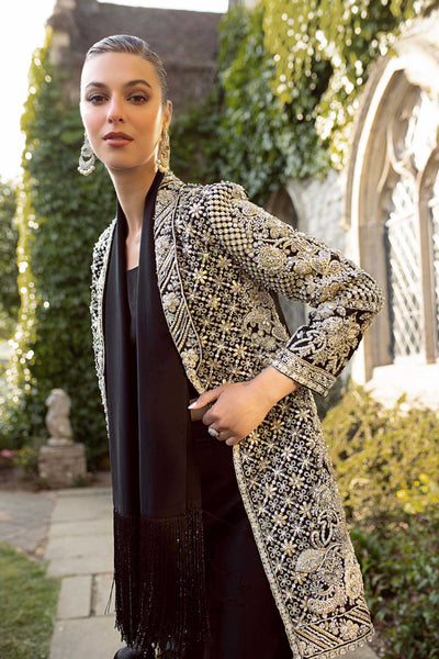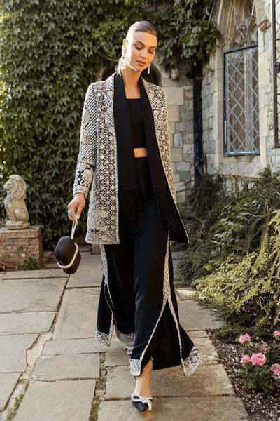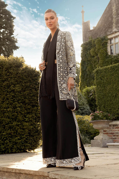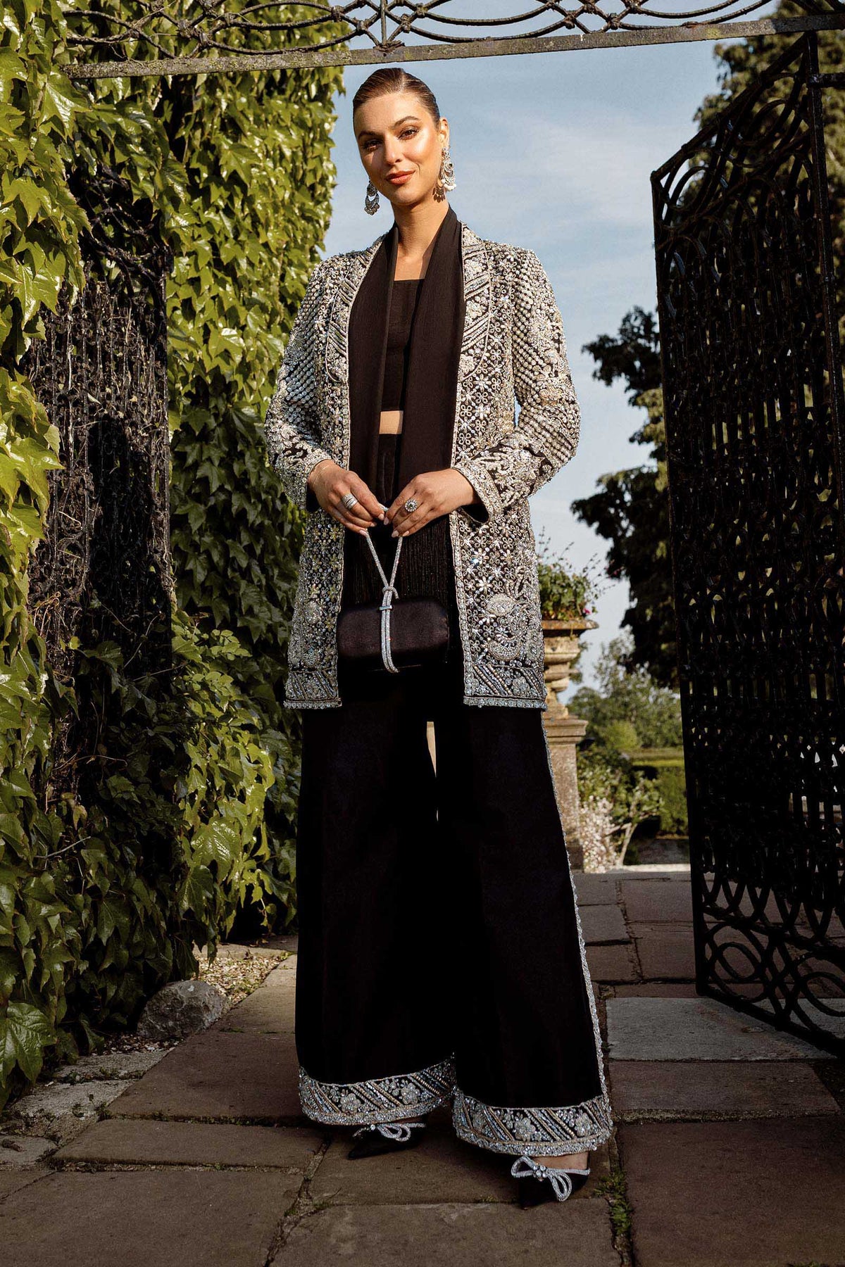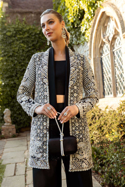 Ravelle' is a bold expression of modern regality. This striking ensemble features a fully encrusted jacket adorned with intricate dabka-naqshi, shimmering crystals, glistening beads, and luminous pearls. Paired with a structured bustier blouse, tailored trousers, and a coordinating scarf, this fusion masterpiece is designed to make an unforgettable statement at any grand celebration.