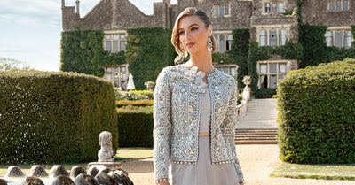 Presenting 'Delyra', a combination of classic elegance and modern artistry. Crafted in soft grey and sea-green hues, this masterpiece whispers beauty. IFeaturing a jacket hand-embellished with delicate details of mukaish, piple gira, beads, crystals and dabqa-naqshi that unfurls dramatic baroque patterns. The heavenly neckline embellished with 3D florets adds a divine touch of glamour. While flared ombre skirt crowns the ensemble. Supremely chic, modern and sophisticated, designed to redefine elegance for special occassion.