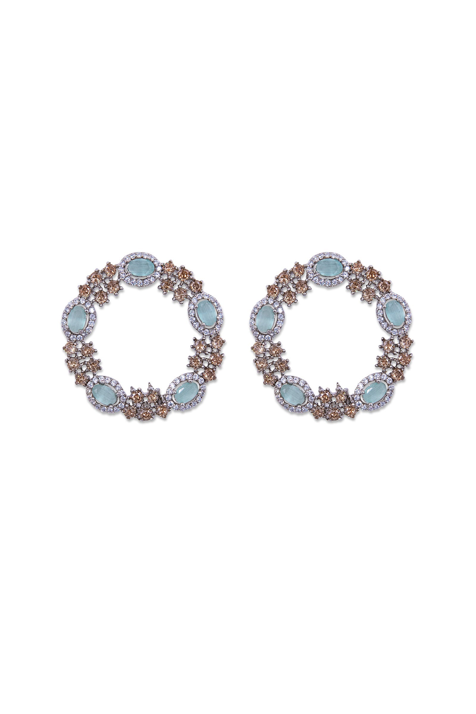 Earrings that vibe with every look - They showcase hollow hoops embellished with mint green cat's eye stones along with champagne zircons intertwined with heavenly white zircons. These earrings offer timeless sophistication & effortless grace.