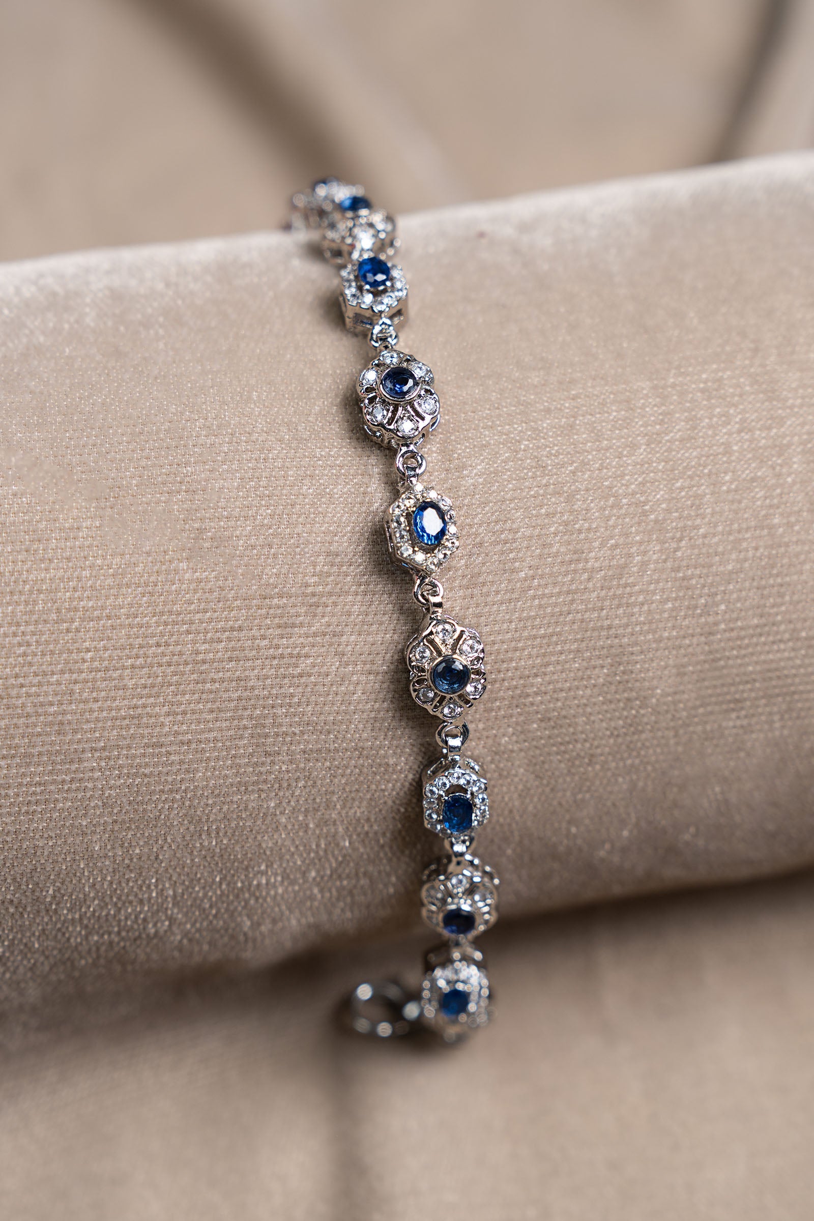 Boldly modern, this bracelet glimmers with deep sapphire blue and sparkling white zircon florets —an artistic blend of edgy elegance, romantic allure, and contemporary grandeur. Composition: Silver Lock: Spring Lock Length: 6 inches (Adjustable upto 1.5 inches) Care Instructions: Wipe Clean