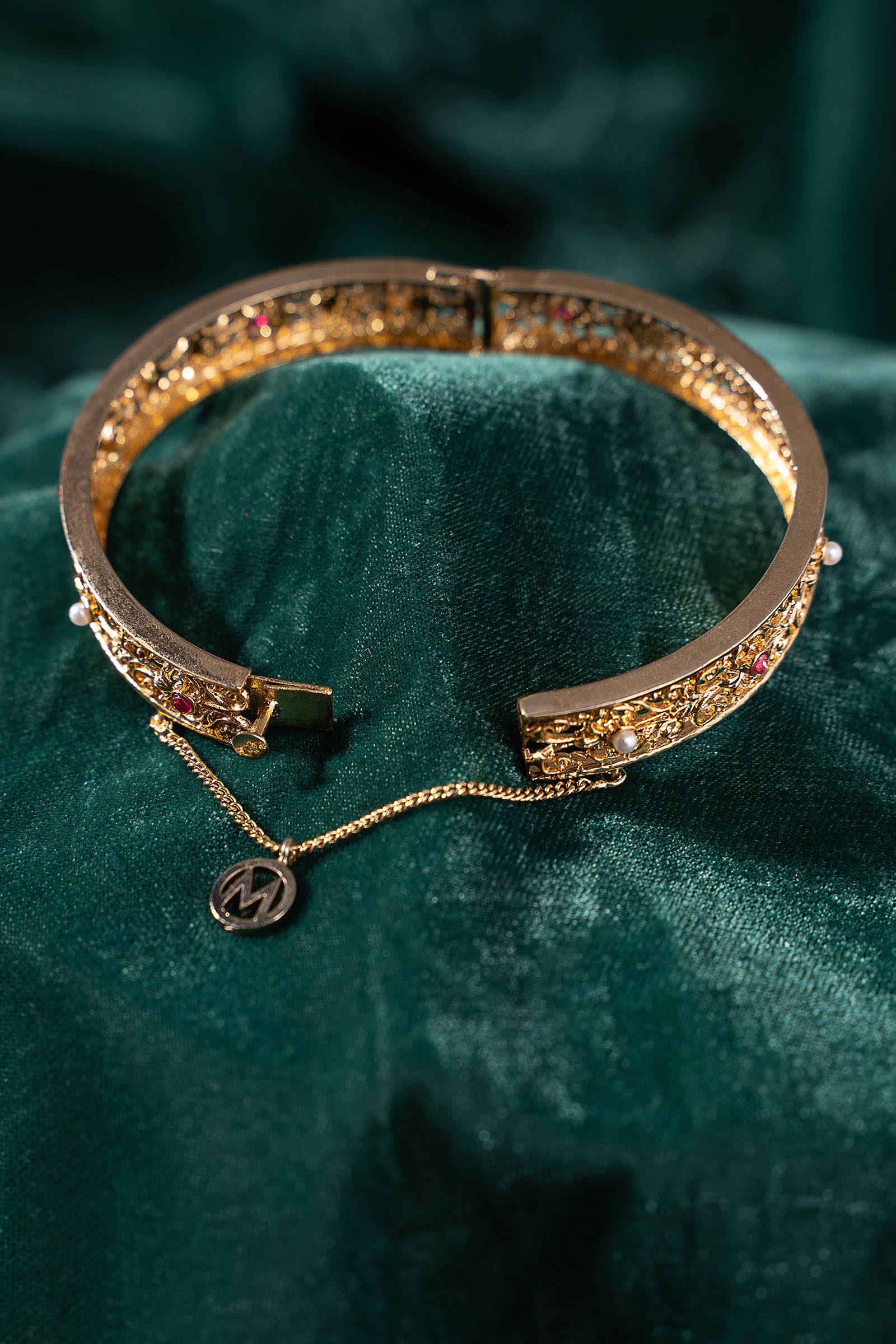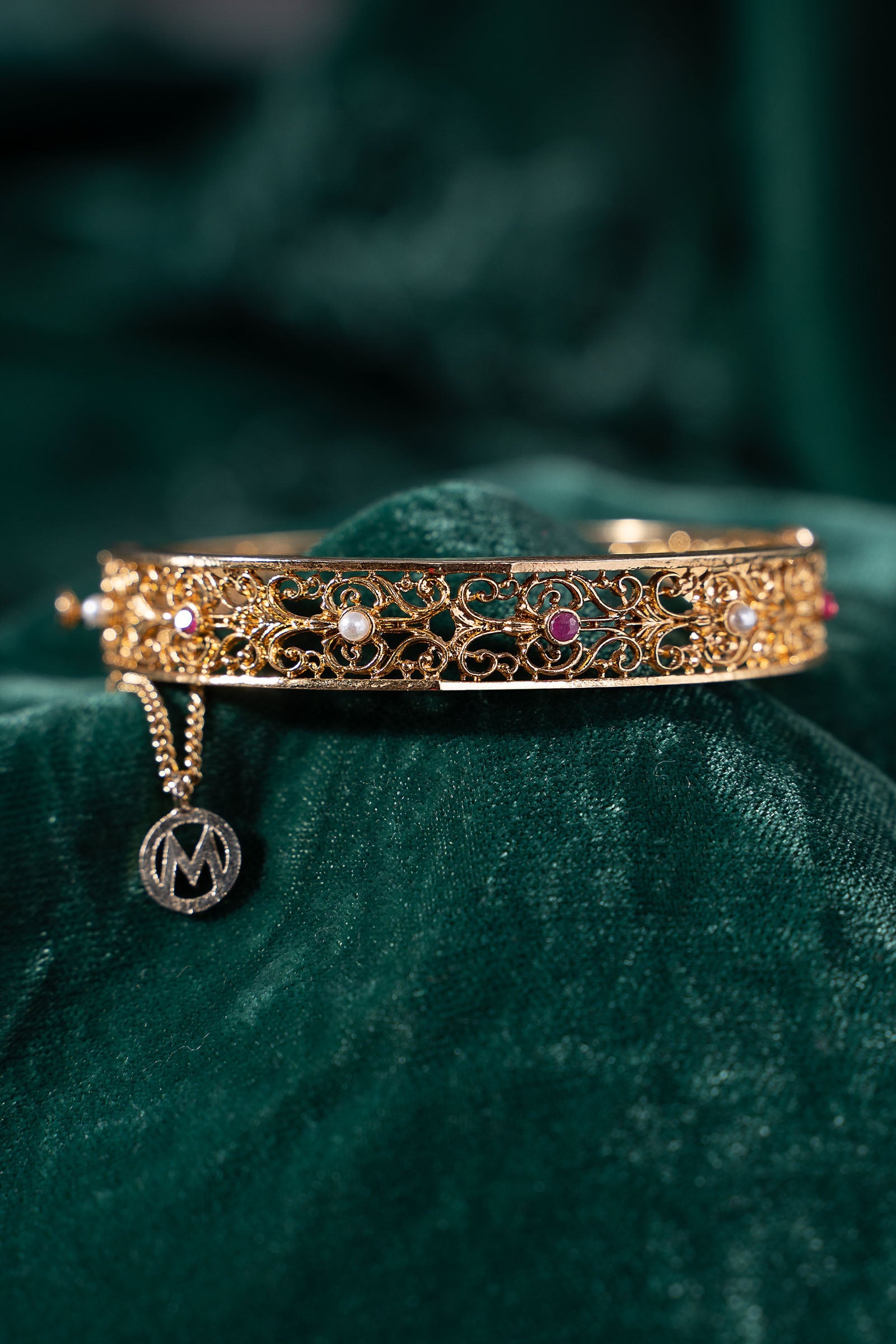 A vision drawn from royal gardens, this churi embodies the splendor of Rani Bagh artistry. Delicate ivy motifs wind gracefully across its form, embellished with the lush glow of pink chatham and the soft luminescence of white pearls. Every curve echoes regal refinement, evoking palace courtyards and moonlit evenings. Majestic yet graceful, this churi is a tribute to timeless royalty - crafted for the woman who carries elegance like a crown. Composition: 21K Gold Plated Lock: Box Lock Care Instructions: Wipe Clean
