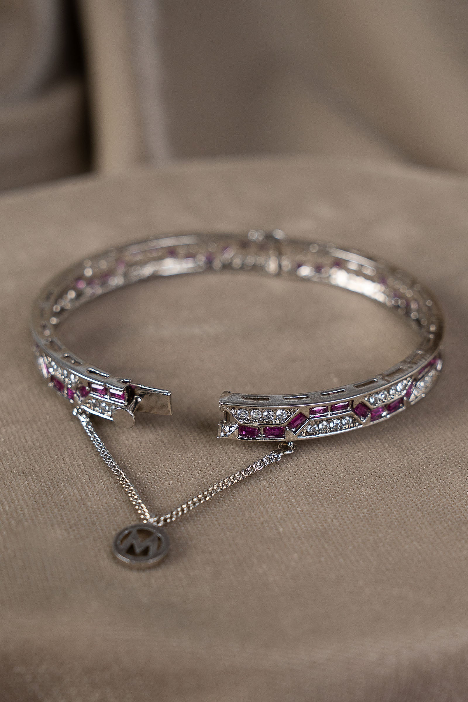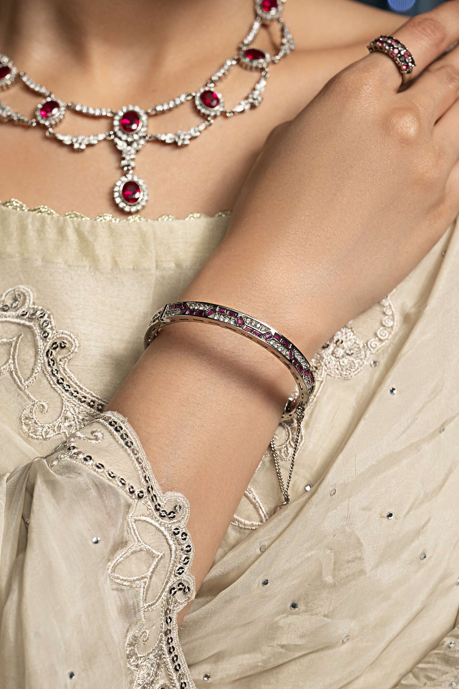 Bold and captivating, this churi shines with vibrant pink rhodolite and sparkling white zircon - an artistic fusion of modern edge, romantic charm, and timeless grandeur. Composition: Silver Lock: Box Lock Care Instructions: Wipe Clean