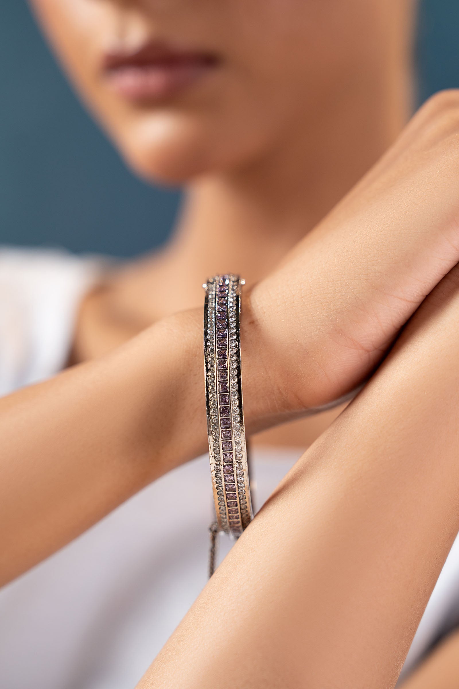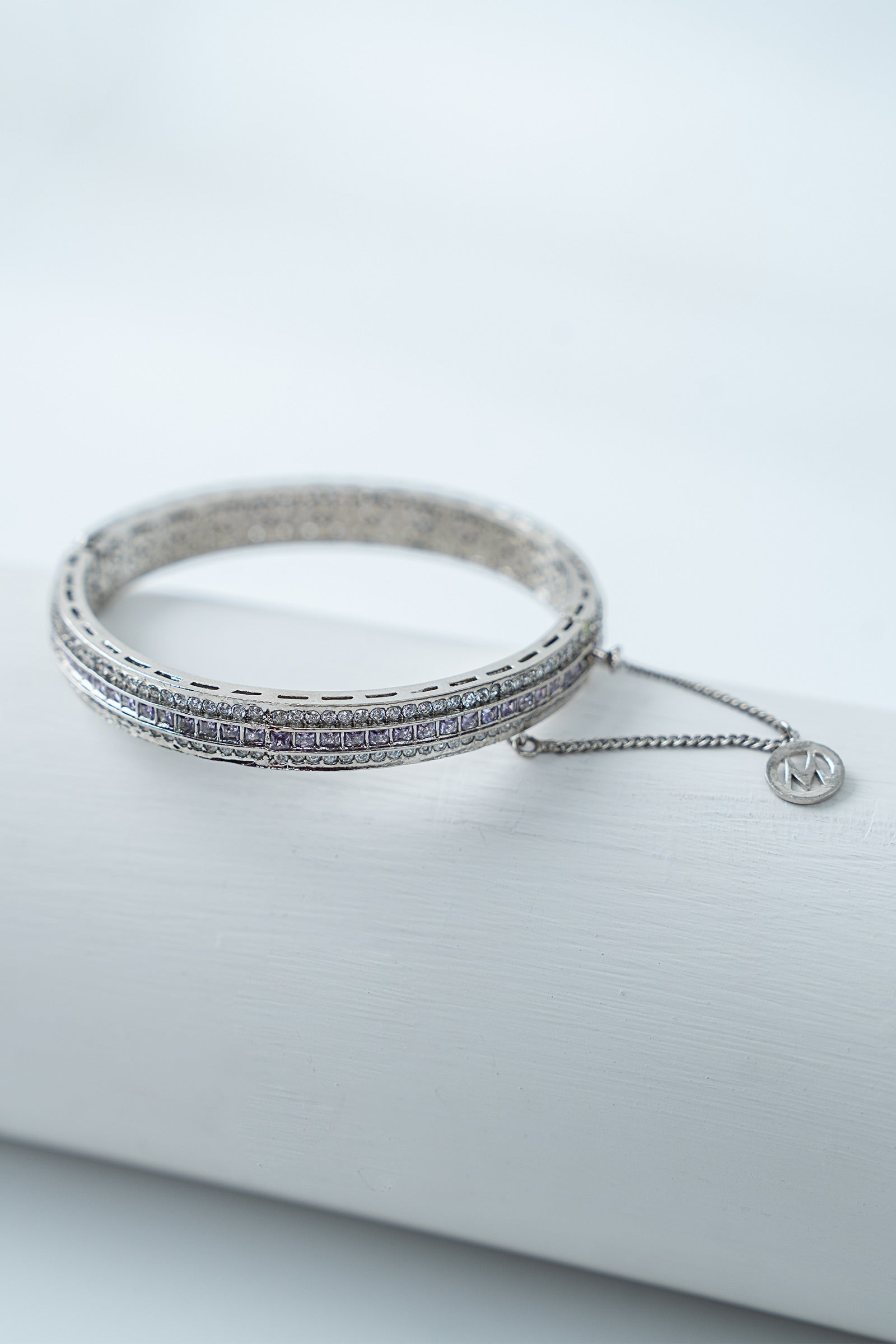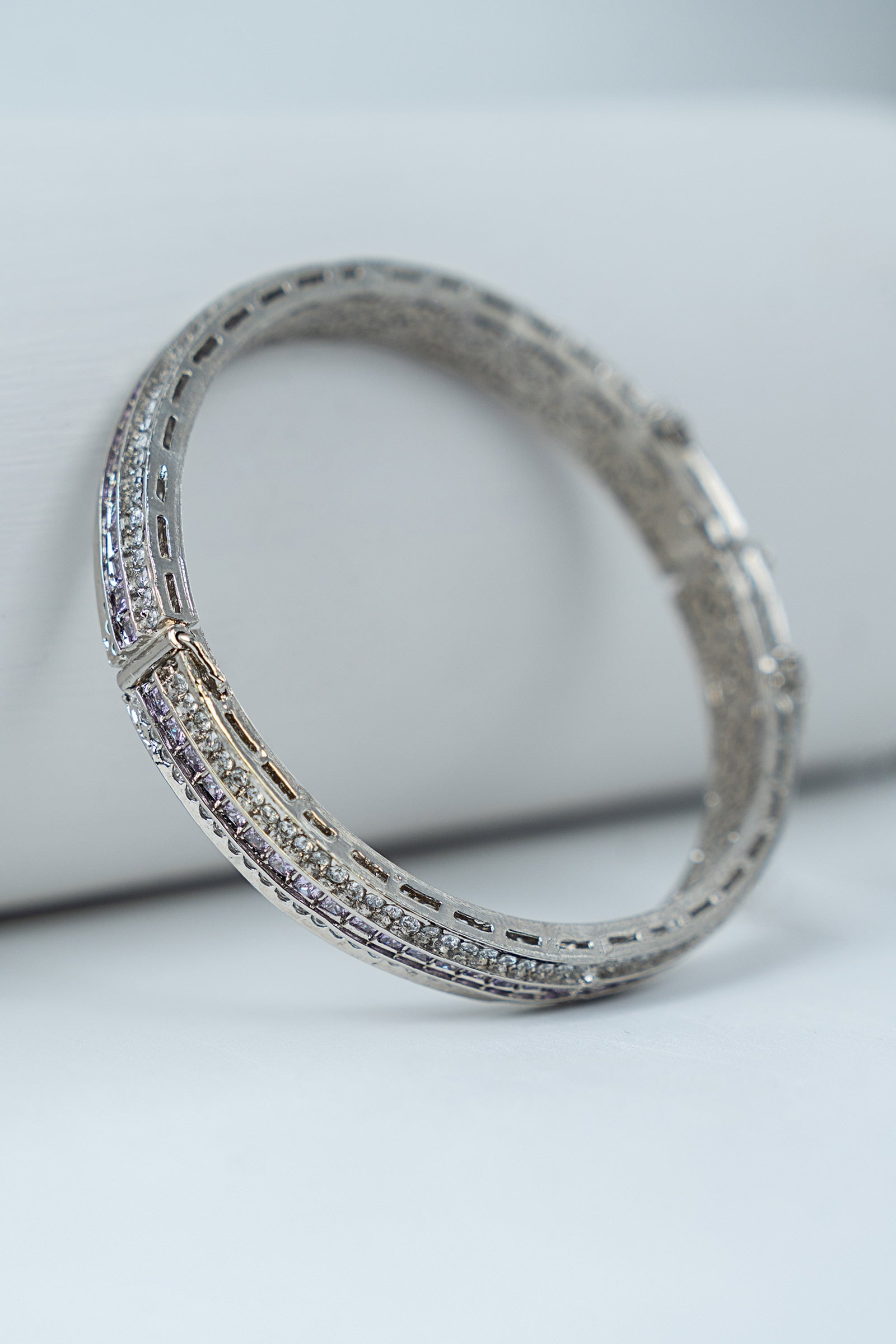 Bold meets beautiful in this statement churi, crafted with sparkling white and light purple zircons artistry. A contemporary twist on classic elegance, designed to turn heads at every celebration. Finish: Silver Lock: Box Lock Product Care: Wipe Clean