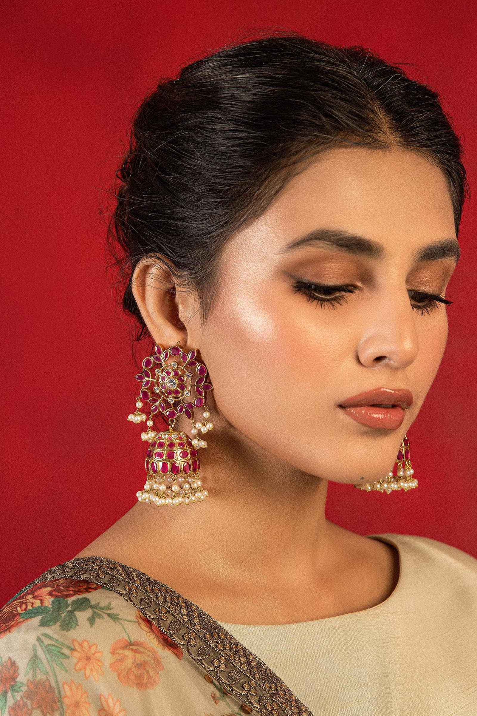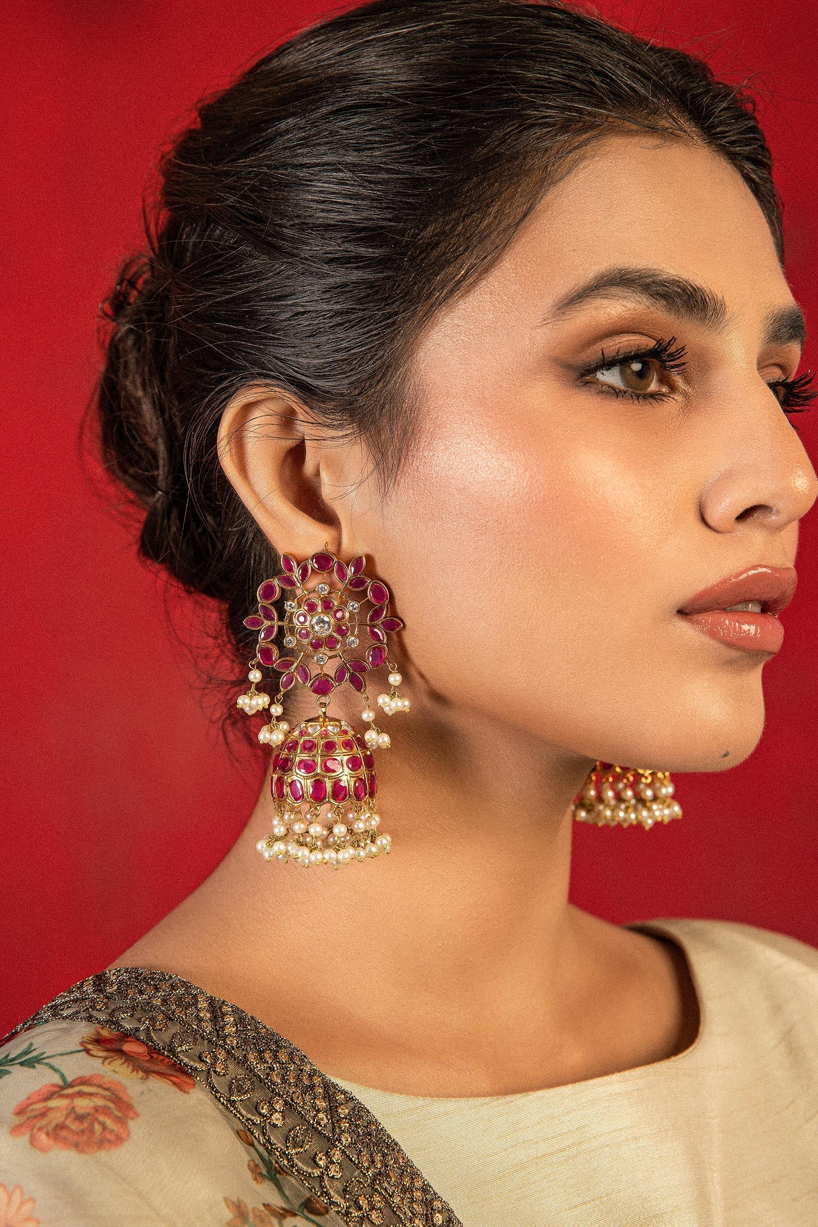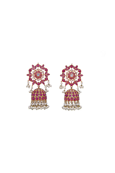 Handcrafted kundan jhumki earrings with a floral motif encrusted with handcut ruby Chatham stones, paired with handcut glass stones with a cluster of pearl piroyi hangings in 21K gold plated finish. Alloy metal