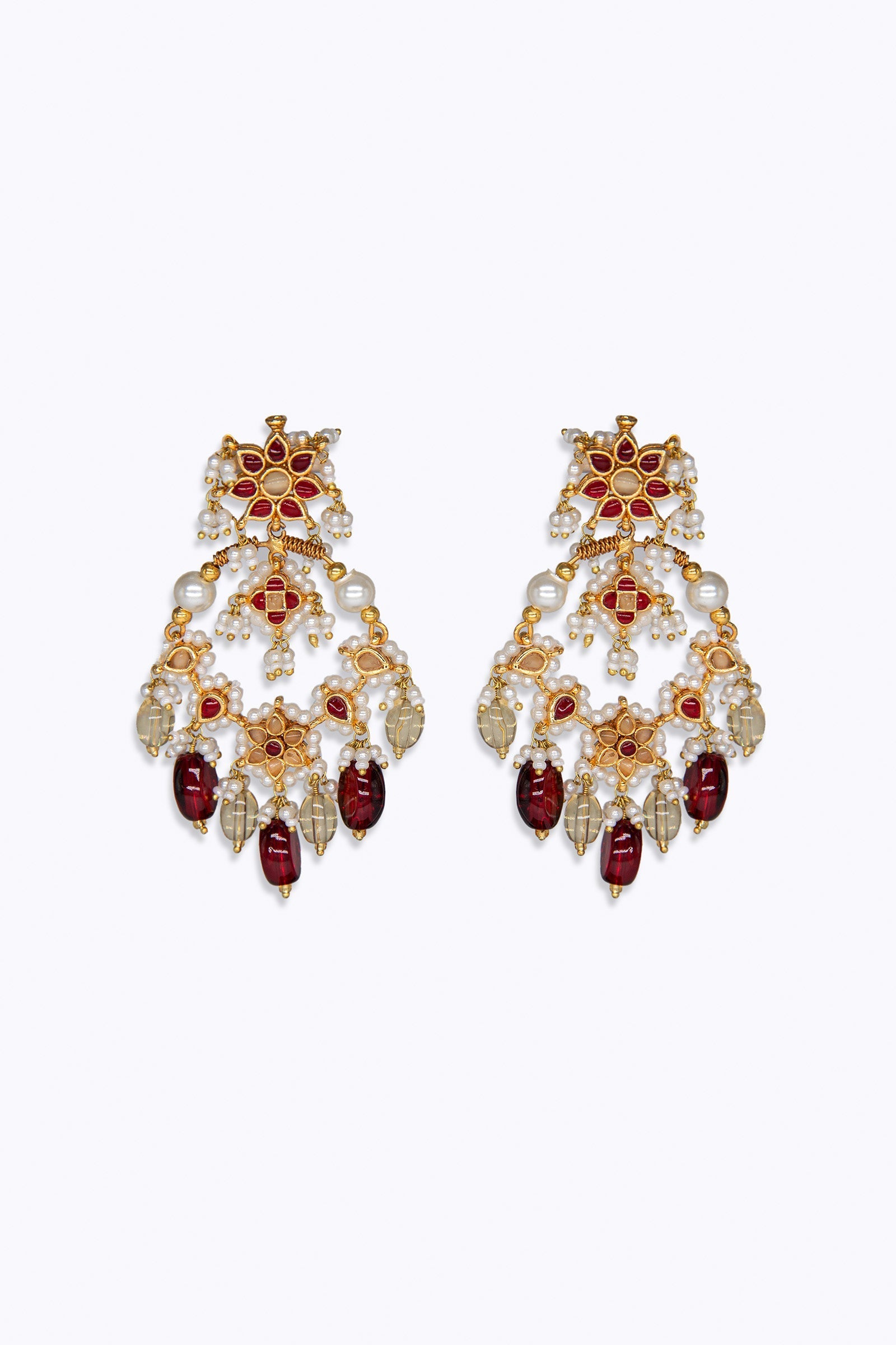 An elaborate blend of ruby red with tint of beige stones on a kundan style dangling earring is all you need this wedding season. Paired with hanging quartz stones and pearl piroyi in 21K gold plating.