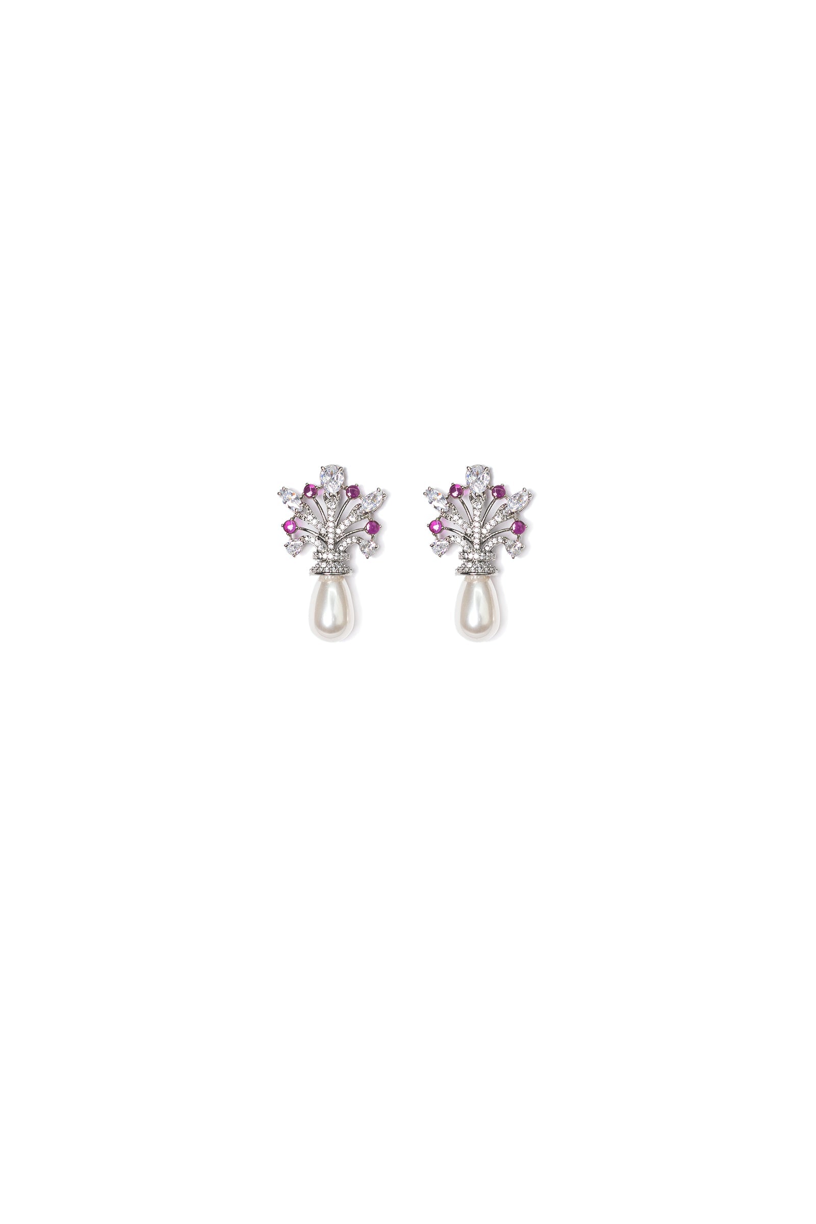 Unleash your inner empress with these pearl drop earrings, crafting elegance with a royal pink chatham stone studded stud intricately woven with zircons in pear and marquise design culminating with a long pearl drop. It is completed in a celestial silver finish, allowing you to shine during all your festivities.DetailsMaterial: Alloy MetalFinish: Silver FinishingColor: Pink Chatham