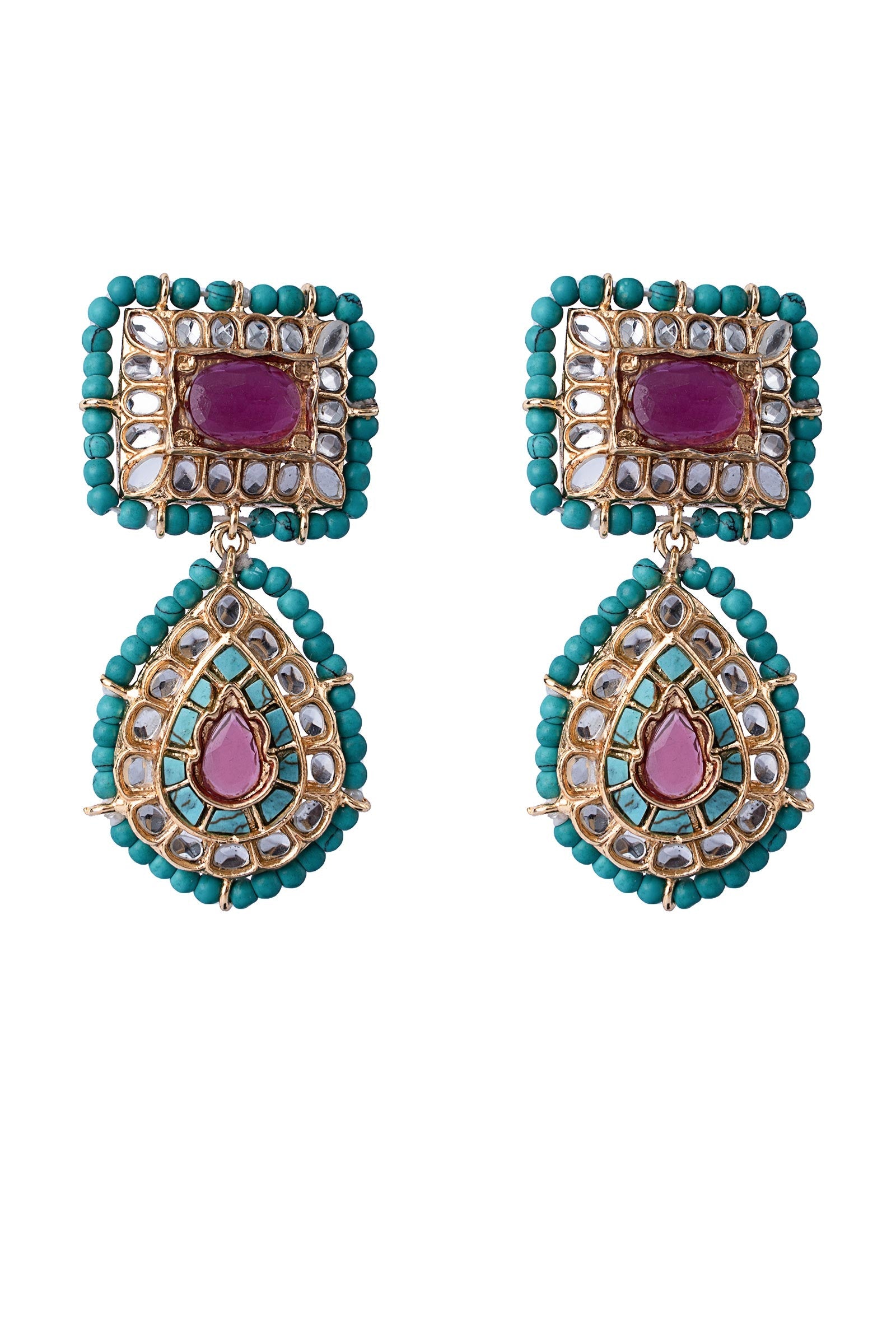 Radiant yet simple, 'Kyra Earrings' offer an effortless head-turning look with playful handcut glass stones intertwined with pink stone in the center and turquoise pyroi around the kundan setting, blending the style into perfection while allowing you to radiate sheer elegance.
