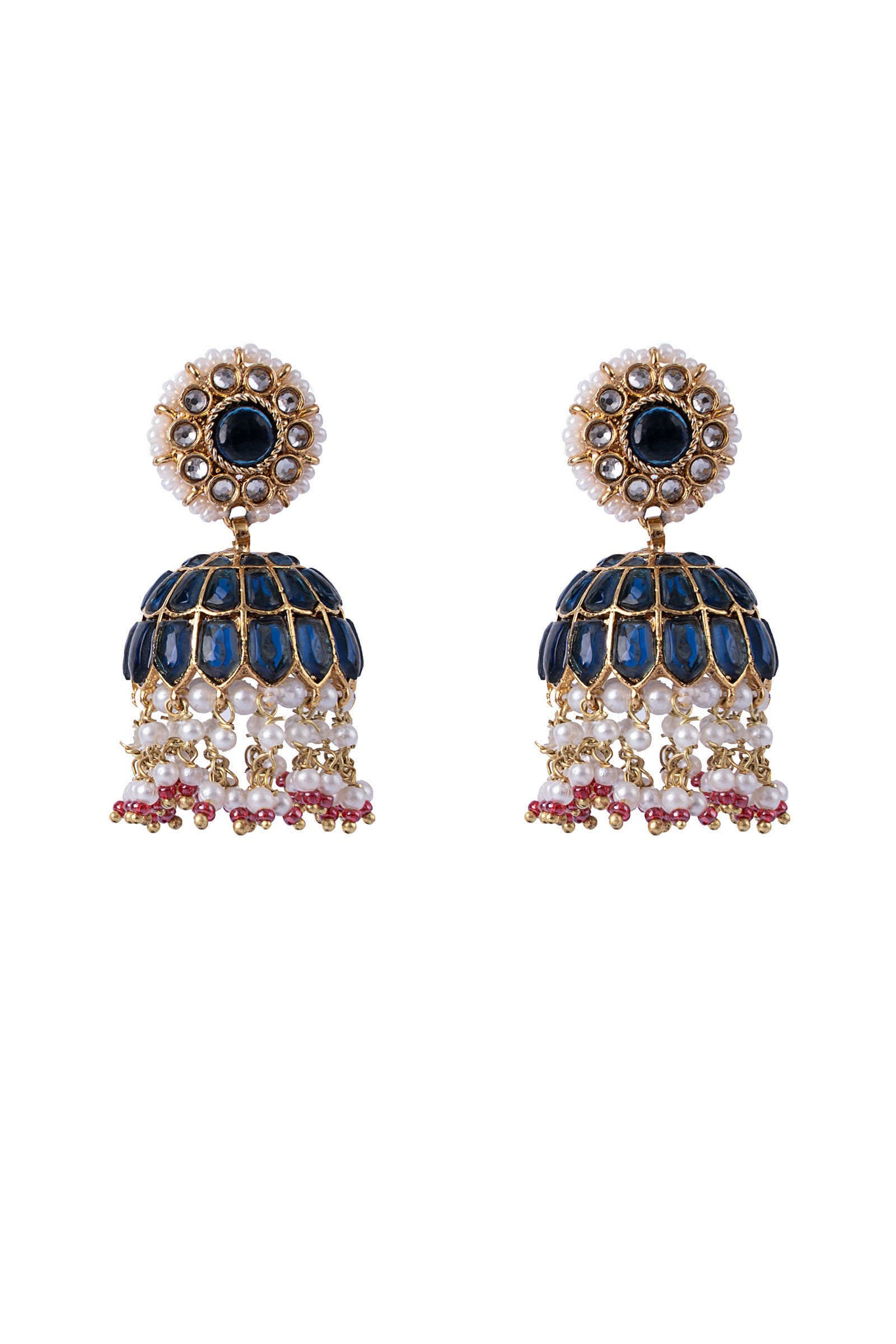 Stunning Phool Jhumka feature handcut white glass stones interweaved with bold blue onyx in a classic setting. The delicate hanging pearl pyroi with red poth offers sophistication, making it a perfect choice for your next formal event.