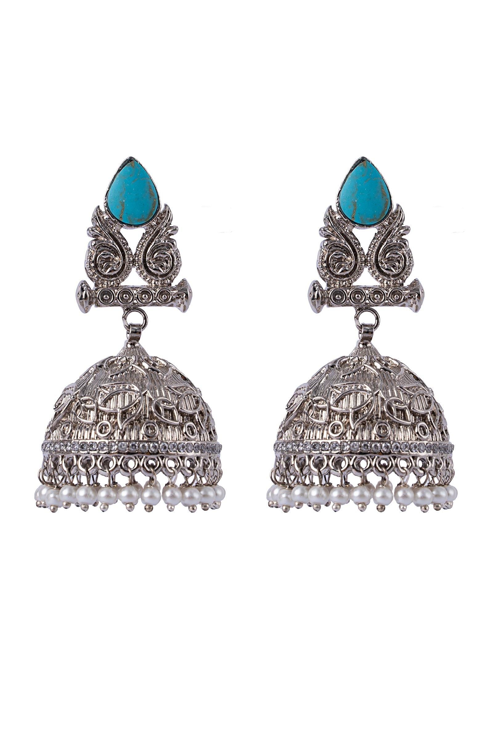 Look enchanting in our Tribal Jhumka, the intricate top motif features a delicate turquoise stone encaged with tribal artistry. The dome shape drop showcases delicate florets, intertwined with heavenly white pearls pyroi that offer a classic ethnic vibe to your look.