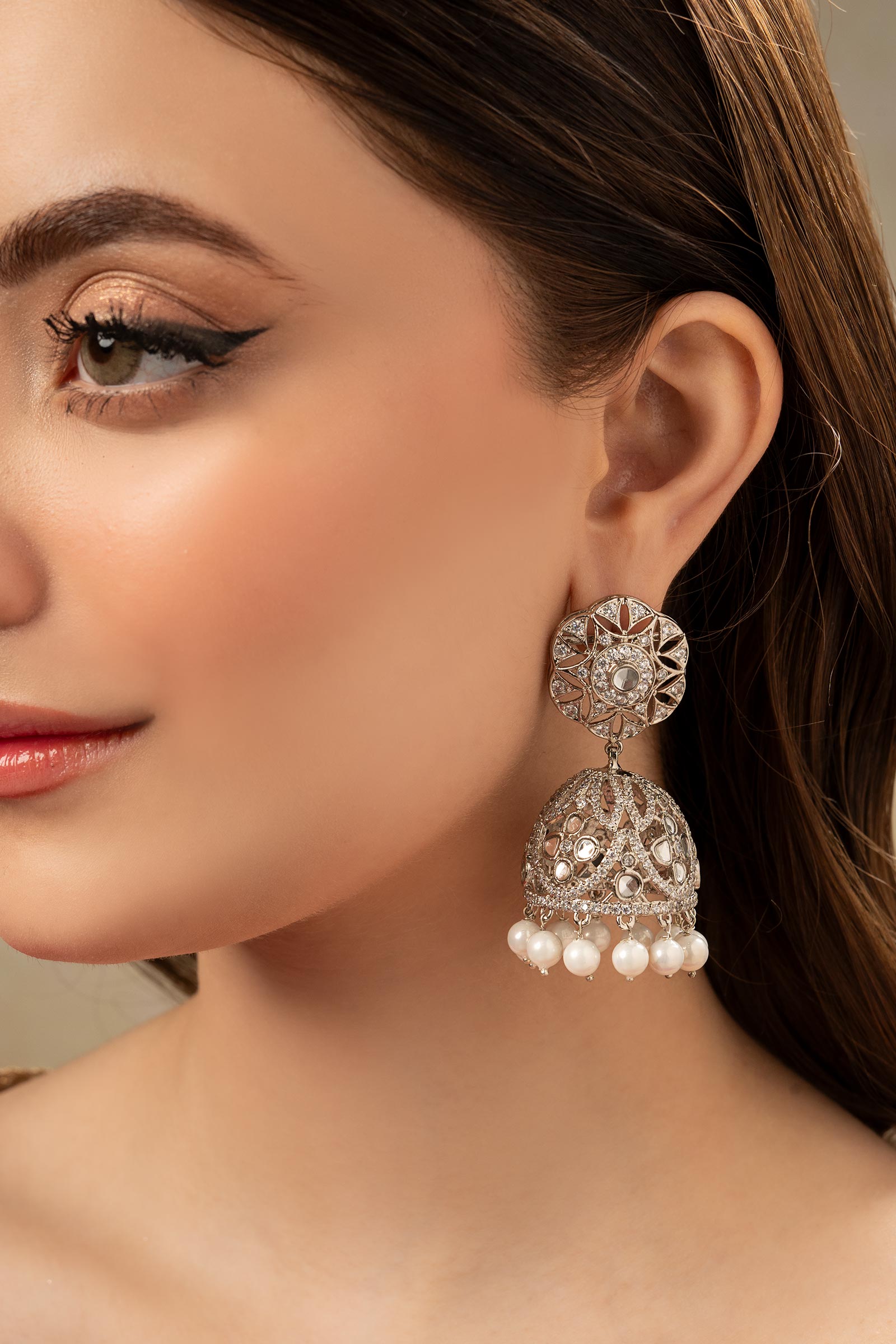 Indulge in the allure of this exquisite masterpiece and let vintage grace redefine your fashion narrative! Meticulously crafted with handcut glass stone, complemented by the refreshing allure of white zircons, and embellished with delicately hanging pearl pyroi. This pair is perfect for a head-turning look. Finish: Silver Back Pin: Sterling Silver Stud Product Care: Wipe Clean