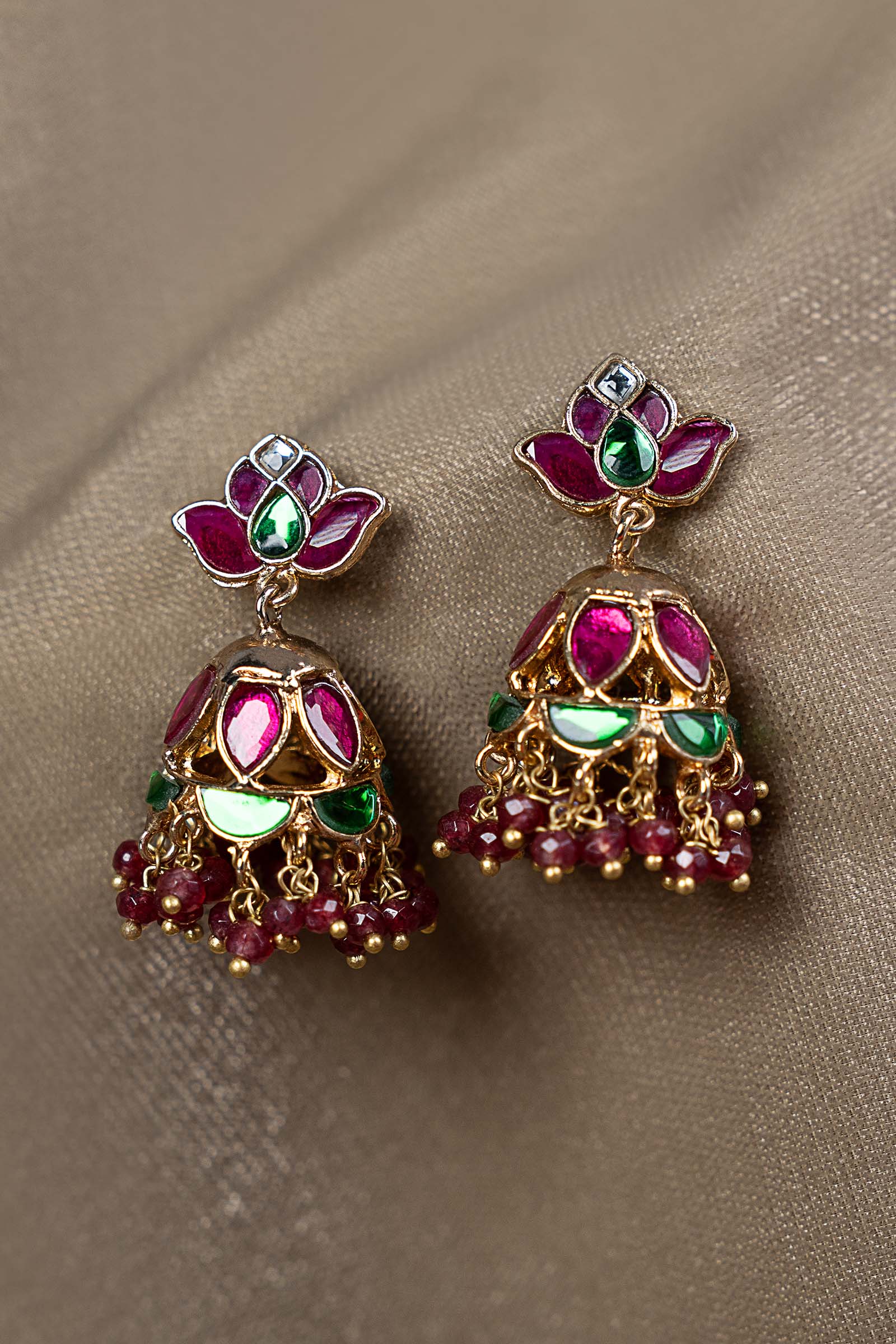 An ode to timeless artistry, this exquisite jhumka features a delicately sculpted lotus stud leading into a richly crafted metal dome. Adorned with luminous pink chatham and deep green onyx stones, it is finished with graceful pink karki hangings that sway with poetic charm. Regal yet romantic, this statement piece is designed to elevate every look with grandeur and unmistakable elegance. Composition: 21K Gold Plated Back Pin: Sterling Silver Stud Care Instructions: Wipe Clean