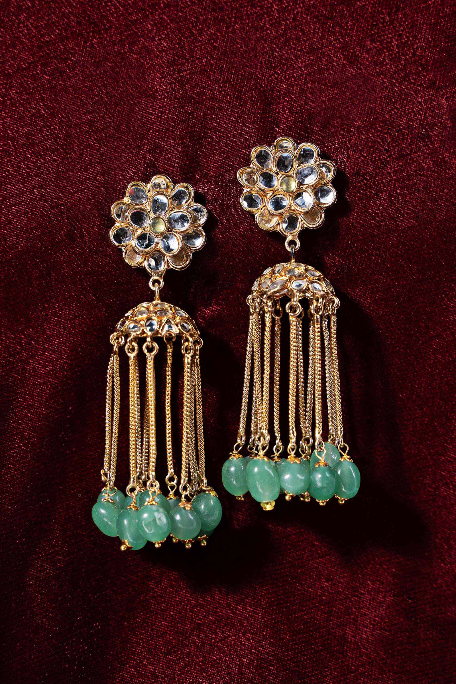 A graceful ode to floral artistry, this jhumka begins with a delicately sculpted flower stud adorned with rich green onyx, encircled by luminous white handcut glass. Flowing below, layered metal chains are finished with green bead hangings that sway with elegant movement. Regal yet refined, this statement jhumka brings timeless charm and captivating sophistication to every ensemble. Composition: 21K Gold Plated Back Pin: Sterling Silver Stud Care Instructions: Wipe Clean