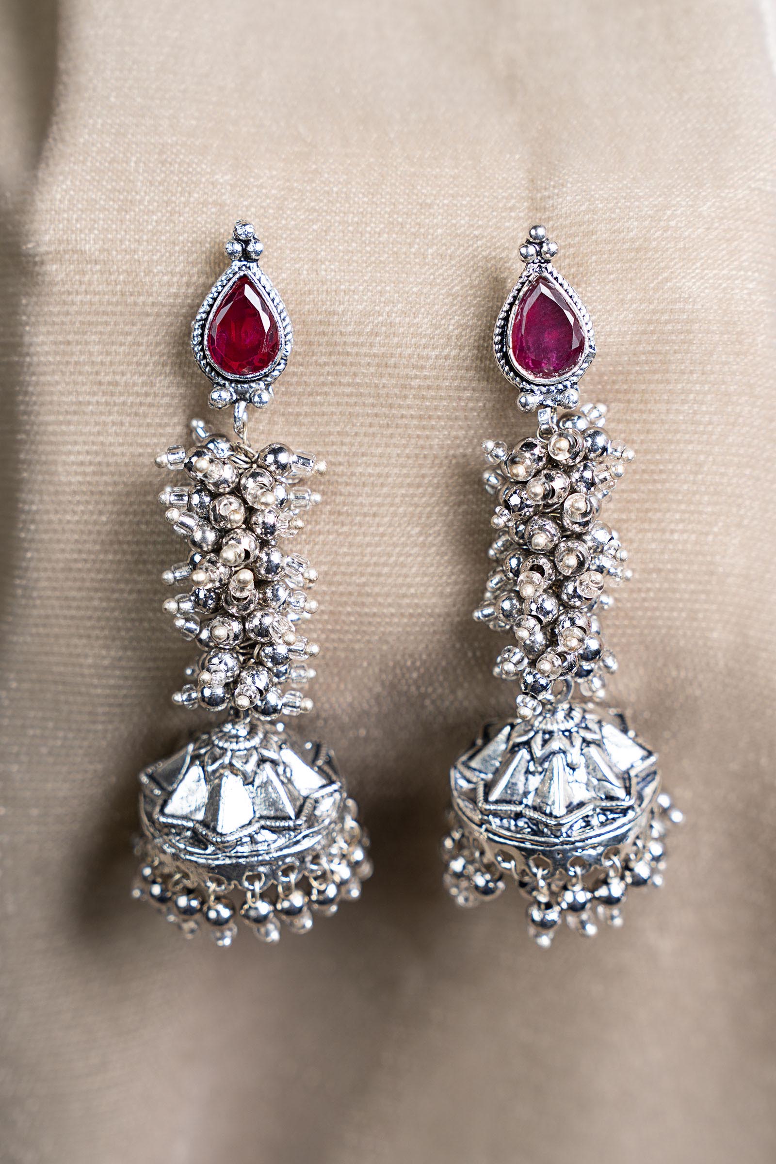 This elegant jhumka features a striking red onyx teardrop stud, meticulously connected to a gracefully crafted dome. Delicate strings of grey pearl piroi, accented with subtle transparent poth, cascade gently, adding a soft, refined movement. The result is a timeless, understated classic piece - subtle yet captivating, perfect for effortless elegance. Composition: Antique Back Pin: Sterling Silver Stud Care Instructions: Wipe Clean