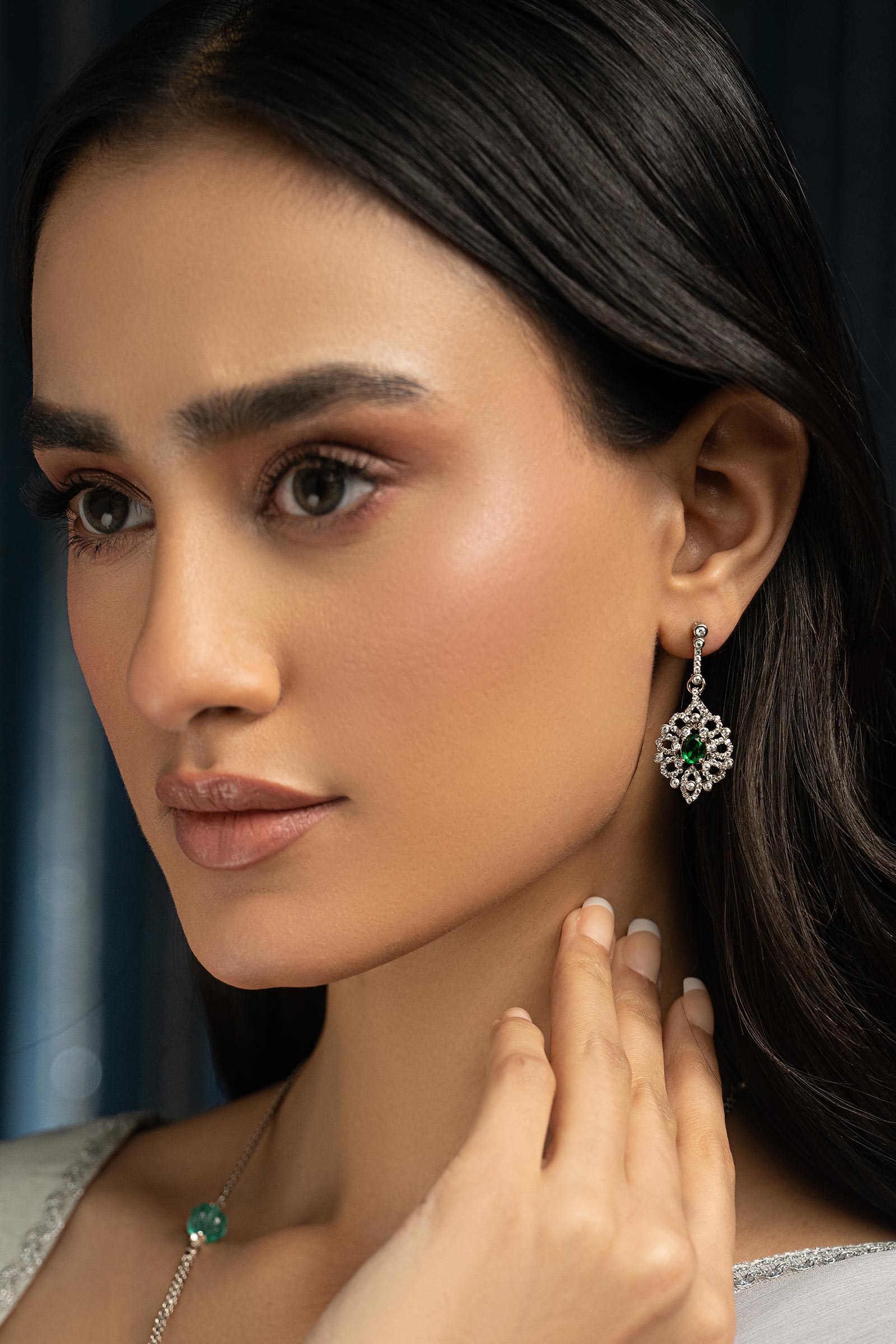 These modern, edgy drop earrings make a bold yet refined statement. Intricately crafted with sparkling white zircons, they catch the light from every angle, while a delicate touch of royal emerald green adds a striking novelty to the design. Sleek, sophisticated, and effortlessly luxurious, they strike the perfect balance between contemporary edge and timeless elegance. Composition: Silver Back Pin: Sterling Silver Stud Care Instructions: Wipe Clean