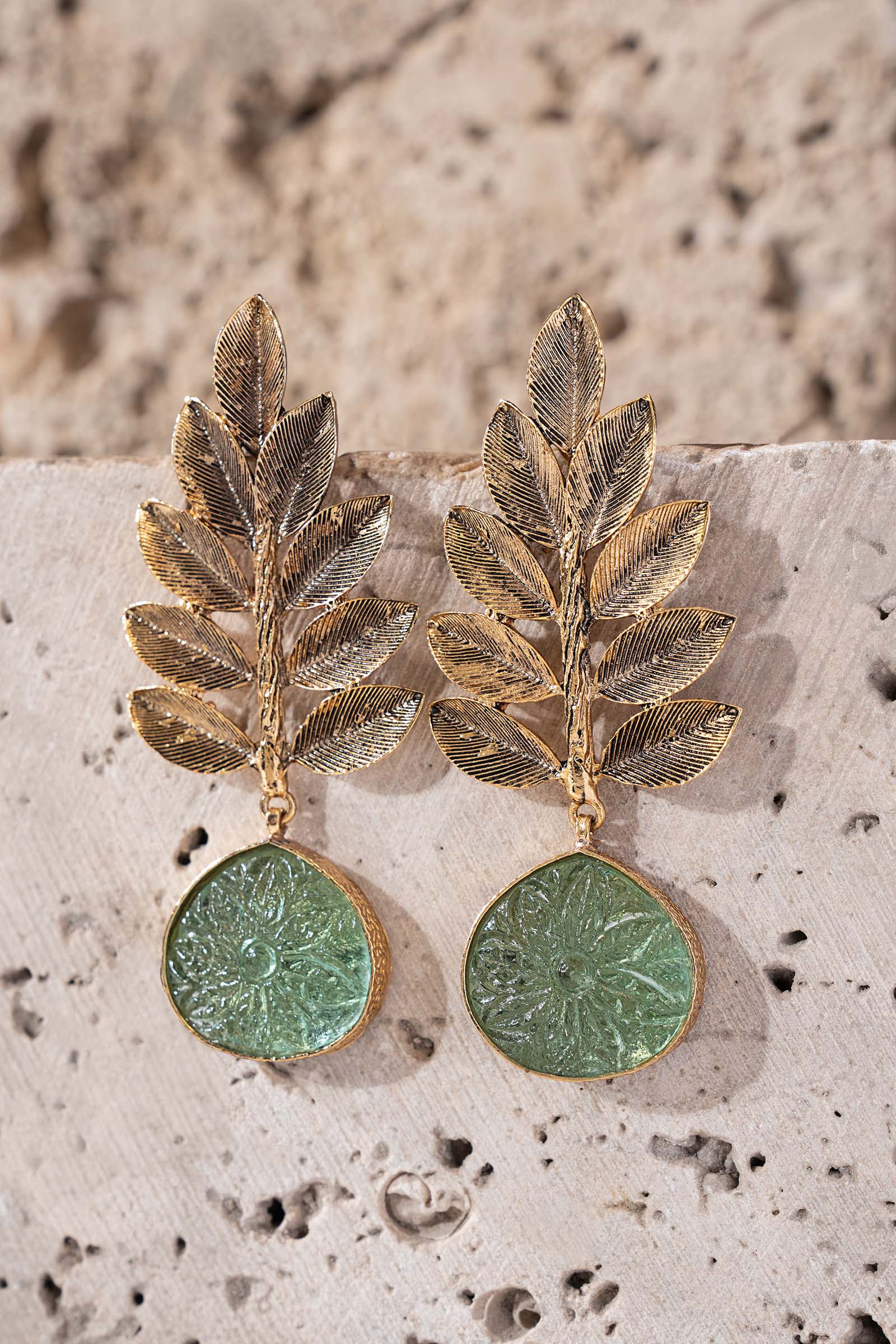 A poetic union of art and nature, our Seraph Earrings bloom as an intricately sculpted tree of life branch, its textured metal leaves frozen in graceful motion. From within, an artistic mint-green drop descends like morning dew, revealing a delicate floral whisper - soft, luminous, and serenely enchanting. Composition: 21K Gold Plated Back Pin: Sterling Silver Stud Care Instructions: Wipe Clean