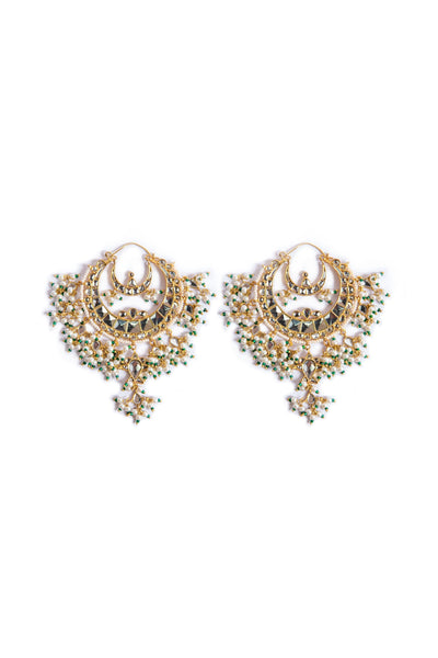 Adorned with a delicate blend of dull gold and multi-colored beads giving it a traditional look. These bali style earrings are enhanced with a sentimental Indian poth pyroi with a tint of green poth, sahara by adding a traditional motif studded with glass cut stones in a chand look escorted by a tint of red kairki.