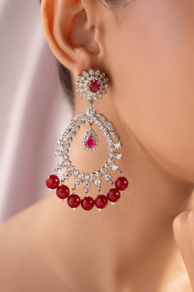 With their brilliant pink chatham stones and glittering white zircons craftsmanship, these earrings combine fierce and feminine elements. A striking ruby red bead drop brings them all to life. An eye-catching accessory that gives any modern festive ensemble joy.