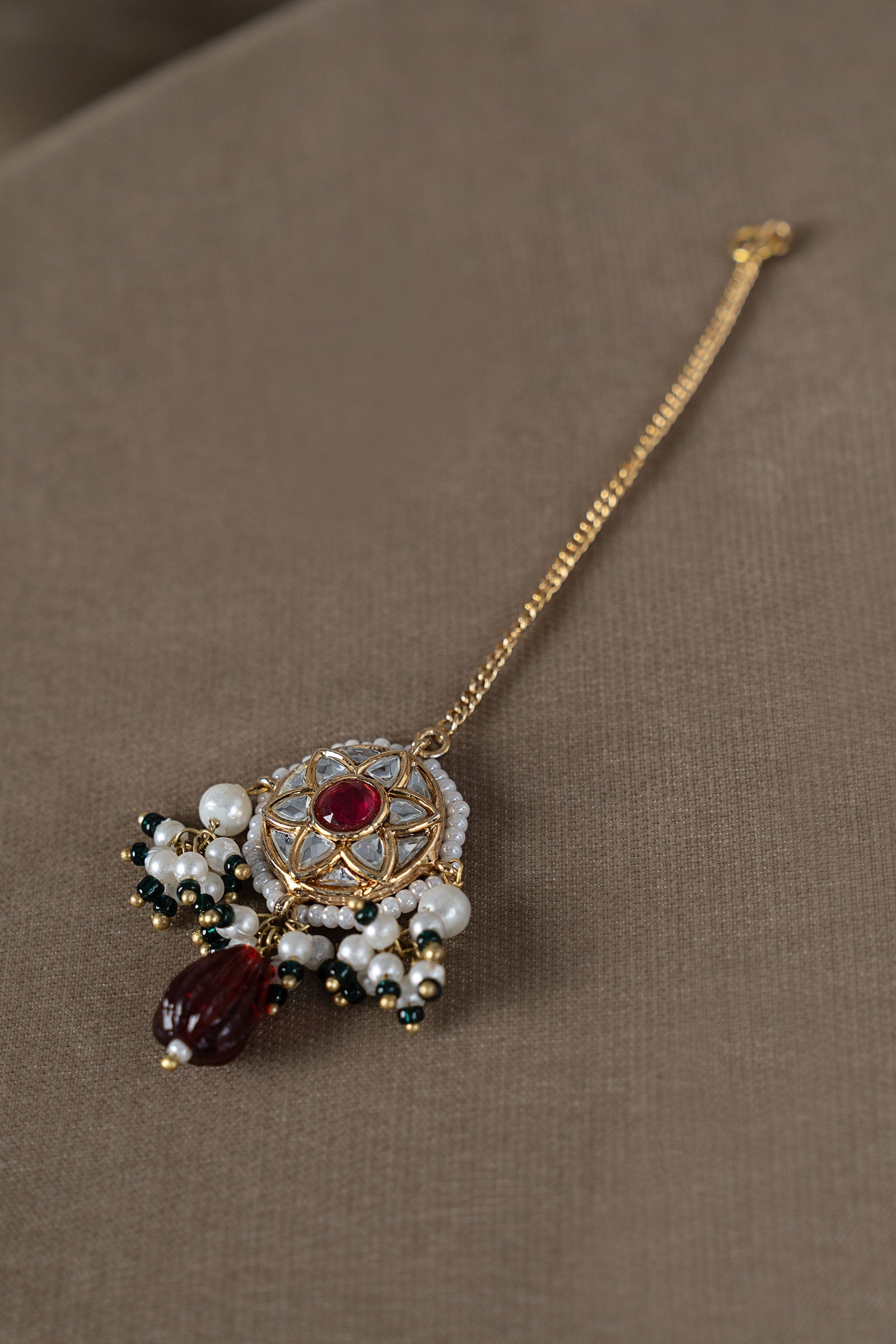 A little crown of festivity, this enchanting kids’ tikka is artfully adorned with sparkling pink chatham and white handcut glass, accented by a playful red carving stone drop. The delicate metal chain sahra, indian poth, and pearl piroi with green poth add a touch of timeless elegance, making every celebration a magical, cherished memory. Composition: 21K Gold Plated Care Instructions: Wipe Clean