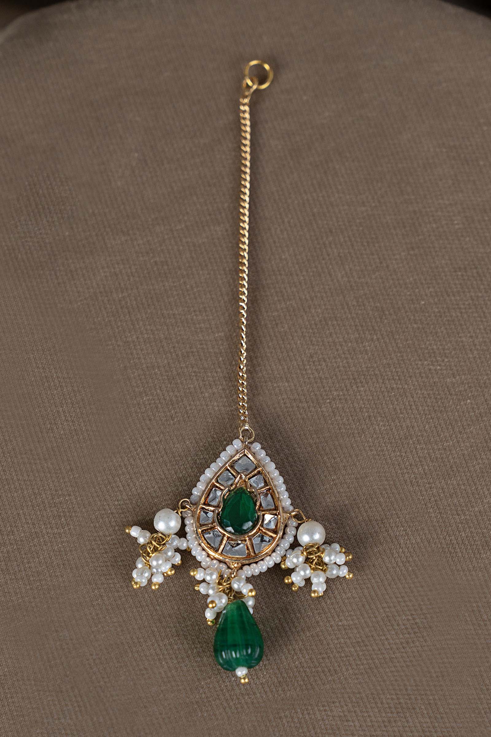 This enchanting kids tikka glows with pristine white handcut glass with a glistening deep green onyx stone in the center, this masterpiece gently flows into a carved green stone drop that makes it a classic choice for occassions Paired with a delicate metal chain sahra, it carries old festive grandeur - made to sparkle in little moments that feel truly magical. Composition: 21K Gold Plated Care Instructions: Wipe Clean