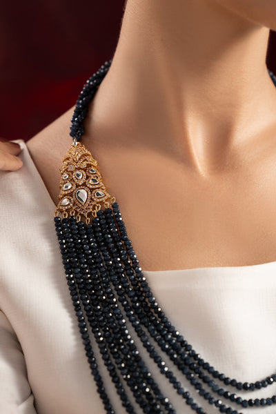 Embrace tradition with this stunning mala, which combines the deep fascination of blue onyx with the brilliant dazzle of champagne zircon and white handcut glass. A timeless elegance that will improve your holiday wardrobe with the ideal balance of sparkle and rich tones.