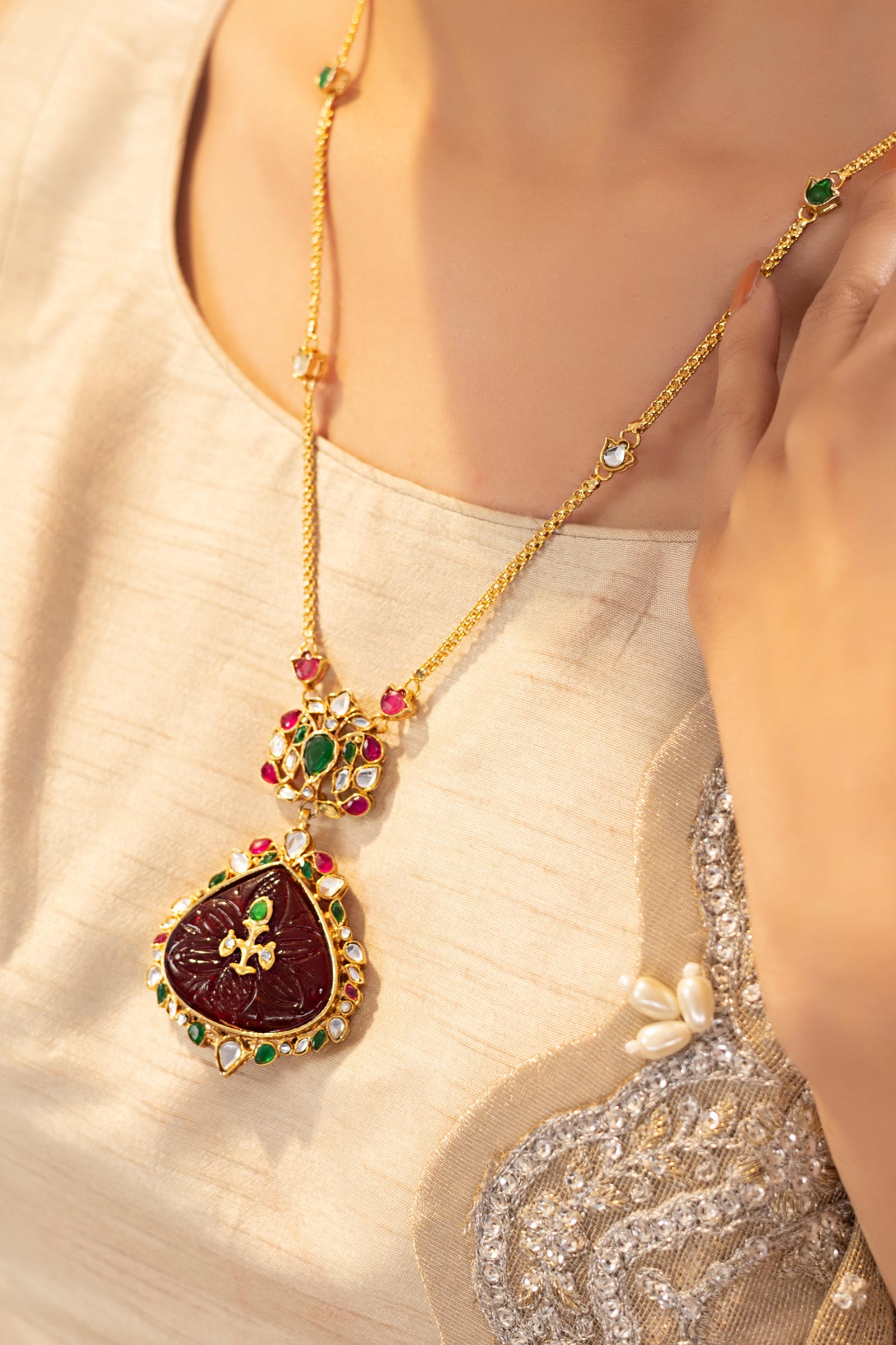 Elevate your festive look with our Carve Pendant - Featuring a delicate chain beautified with two artistic motifs embellished with handcut glass, pink Chatham, green onyx & red onyx stonework. The delicacy it offers is perfect for adding that classic yet glamorous vibe to your style. Finish: 21K Gold Plated Lock: Spring Lock Product Care: Wipe Clean