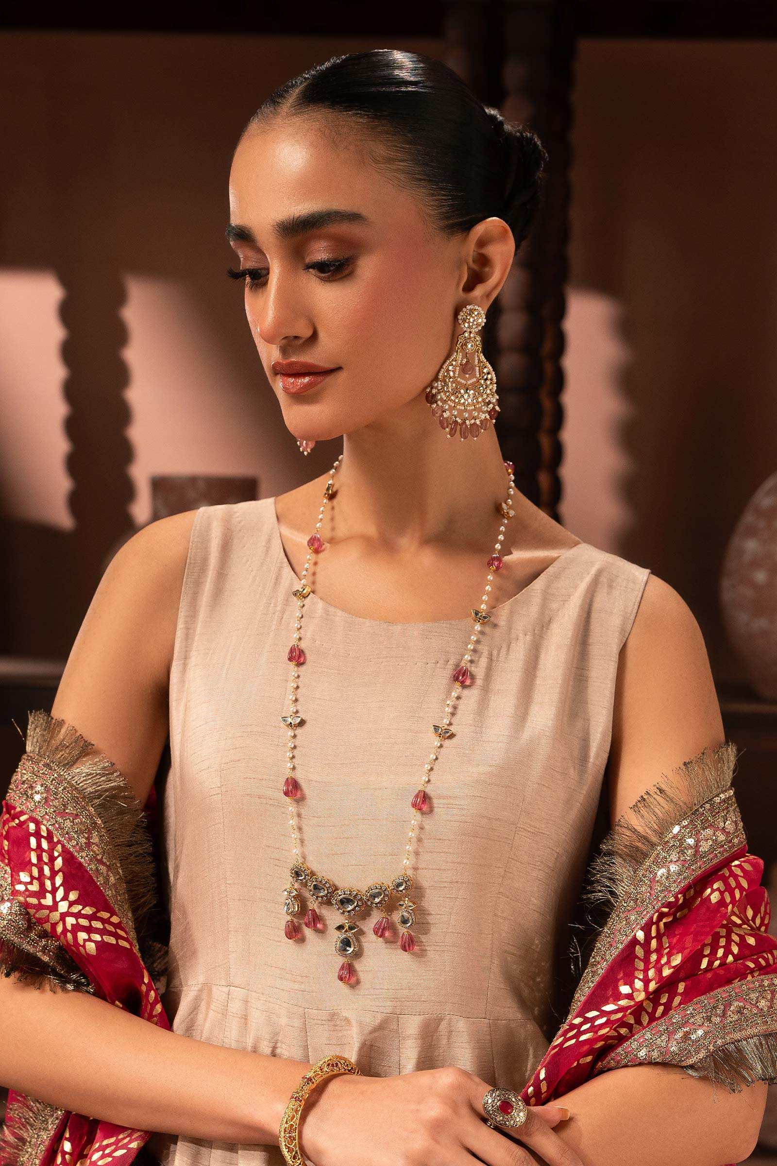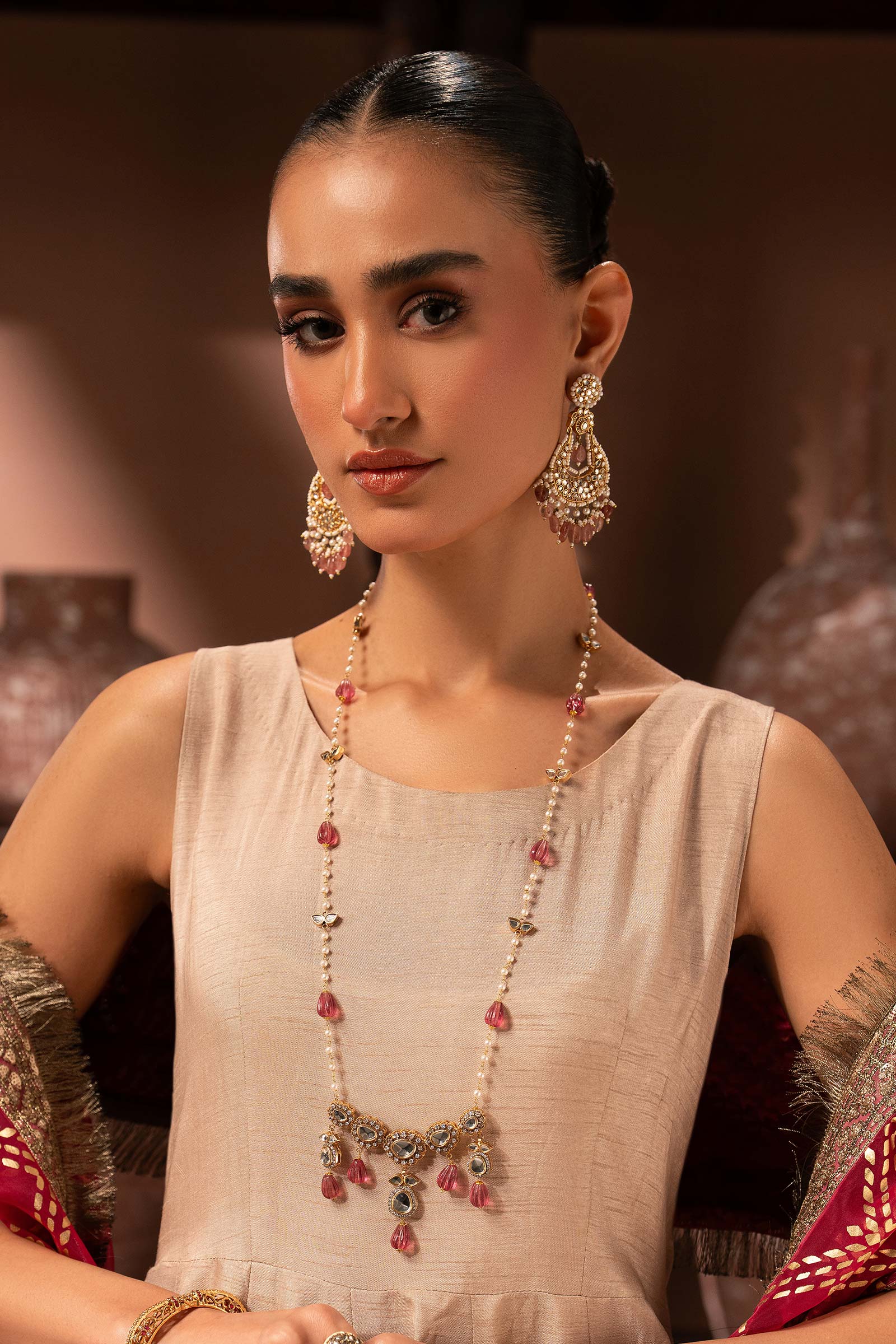 This artistically crafted pendant shimmers with luminous white handcut glass and radiant white zircons, delicately finished with a soft light-pink carving stone drop. Classic yet grand, it carries classic elegance - perfect for moments that call for subtle luxury and everlasting charm. Composition: Ganga Jamni Lock: Spring Lock Length: 28 inches (Adjustable upto 2 inches) Care Instructions: Wipe Clean