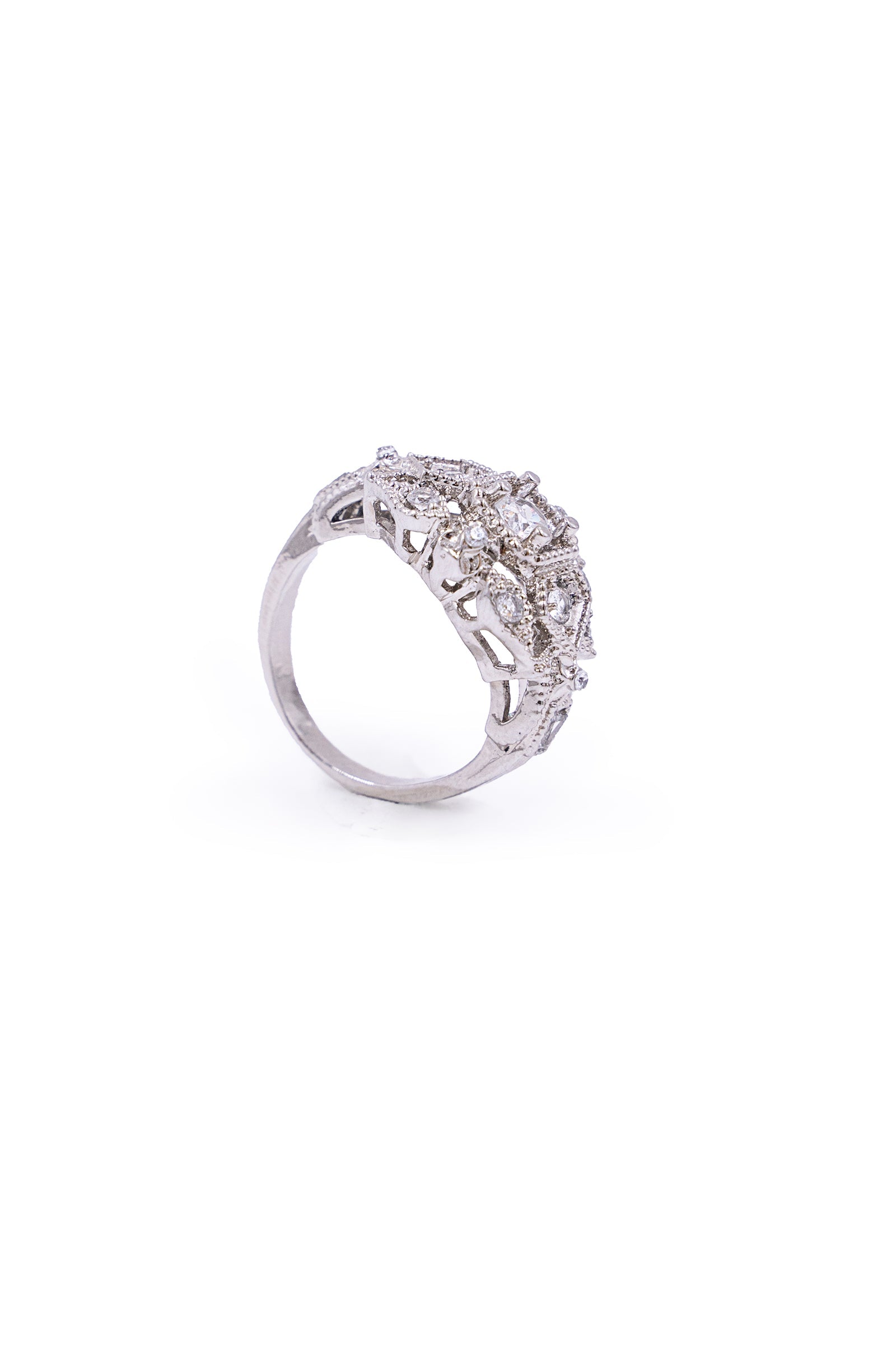 Highlighting your outfit aesthetics with our Baroque Ring - Showcasing a delicately designed medieval frame with details of glistening white zircons artistry that makes it an effortless choice for your festivities. Finish: Silver Product Care: Wipe Clean