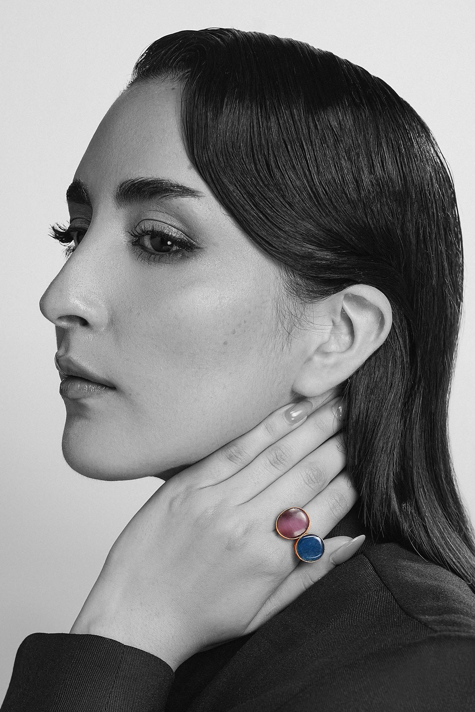 Where artistry meets understated luxury - our Tulin Ring merges purple cats eye and lapiz blue stone in an inricately handcrafted geometric metal frame The gentle shimmer of each stone casts an ethereal glow, making it a masterpiece that balances refined luxury with contemporary artistry - perfect for transforming everyday wear into a celebration of modern romance and serene sophistication. Composition: 21K Gold Plated Size: Adjustable Care Instructions: Wipe Clean