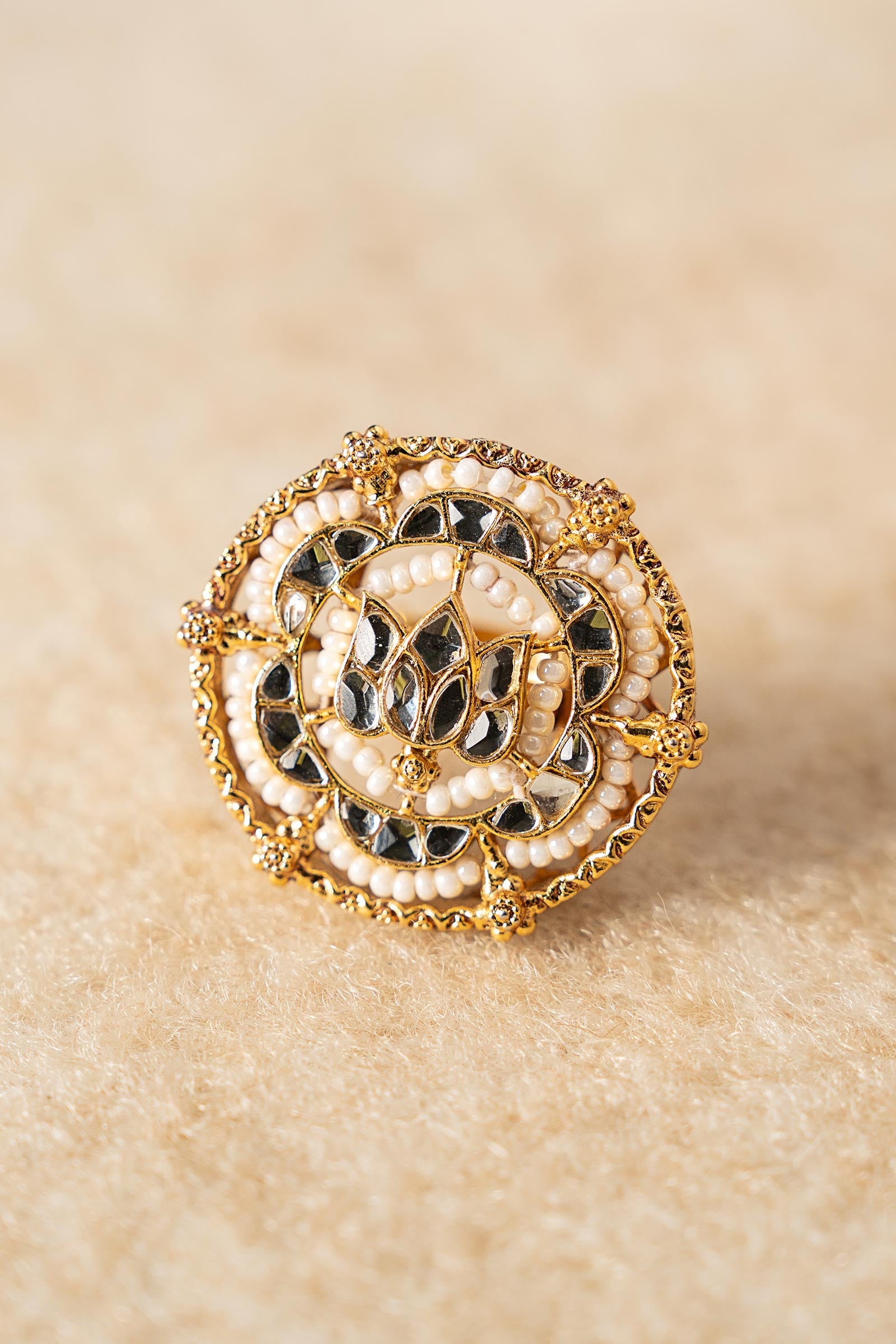 Elegant in its simplicity, this timeless ring showcases the pristine shimmer of white glasscut, beautifully framed with intricate Indian poth pyroi. A graceful nod to traditional craftsmanship, it’s the perfect accent for your festive ensemble. Finish: 21K Gold Plated Product Care: Wipe Clean