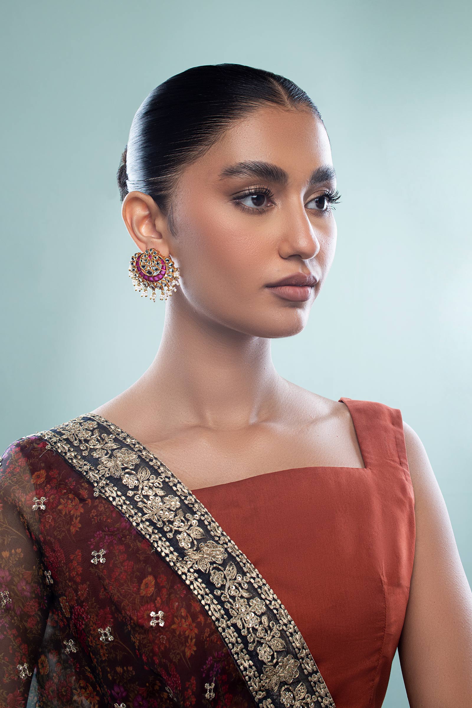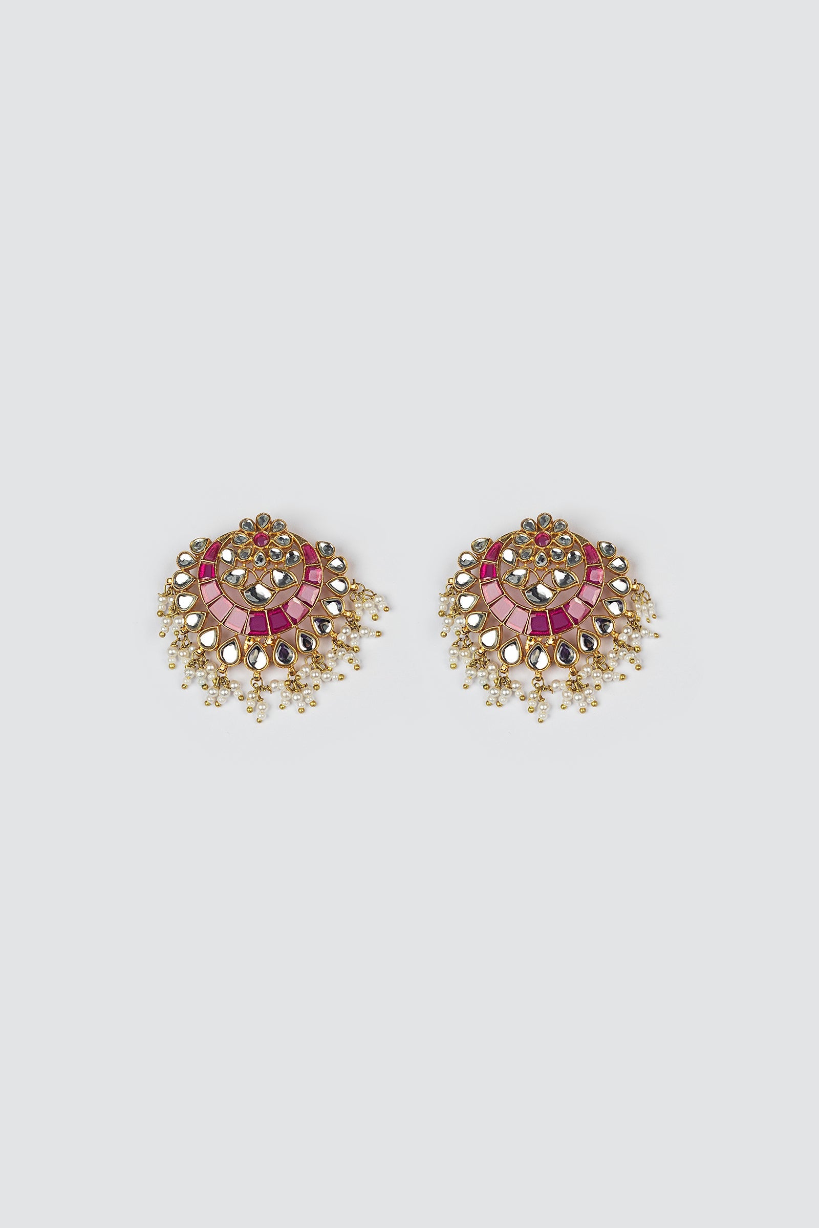 Materials: Handcut Glass, Chatham & Pearls Color: Pink Chatham & White Metal: Alloy Finish: 21K Gold Plating Back Pin: Sterling Silver Stud Product Care: Wipe Clean
