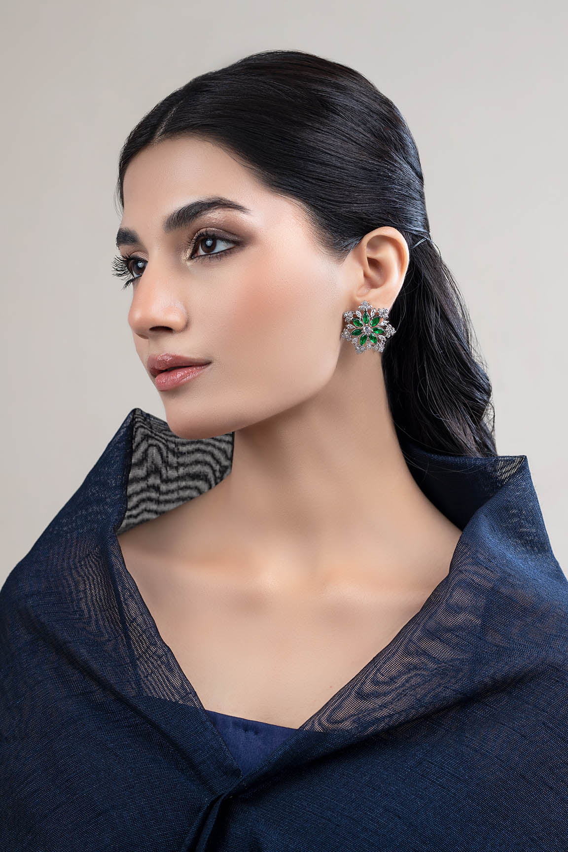 Sparkle elegance with our floral studs, featuring delicate green tourmaline marquise stone petals meticulously framed with polished zircons in a celestial silver finish that lets your radiance shine brighter.
