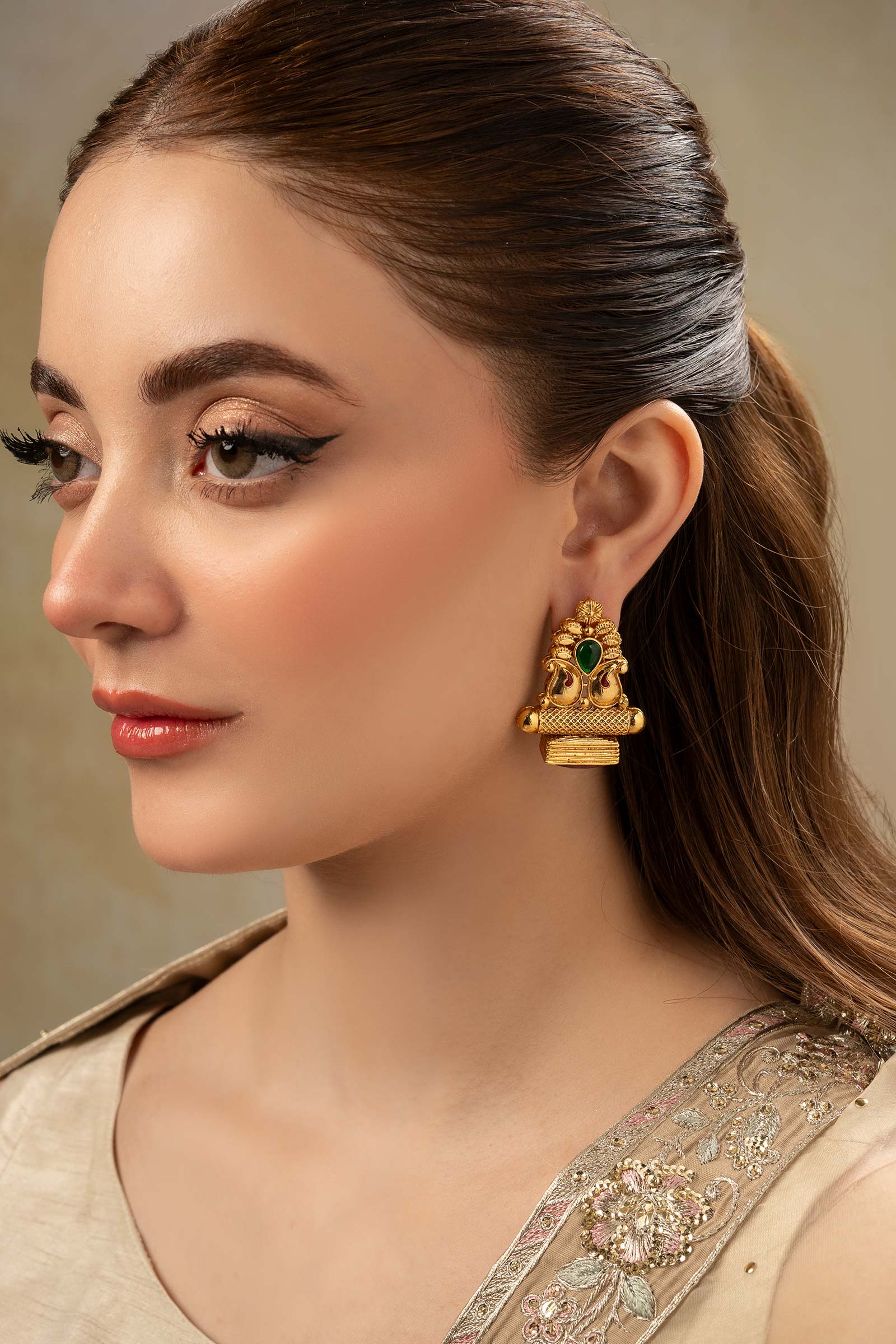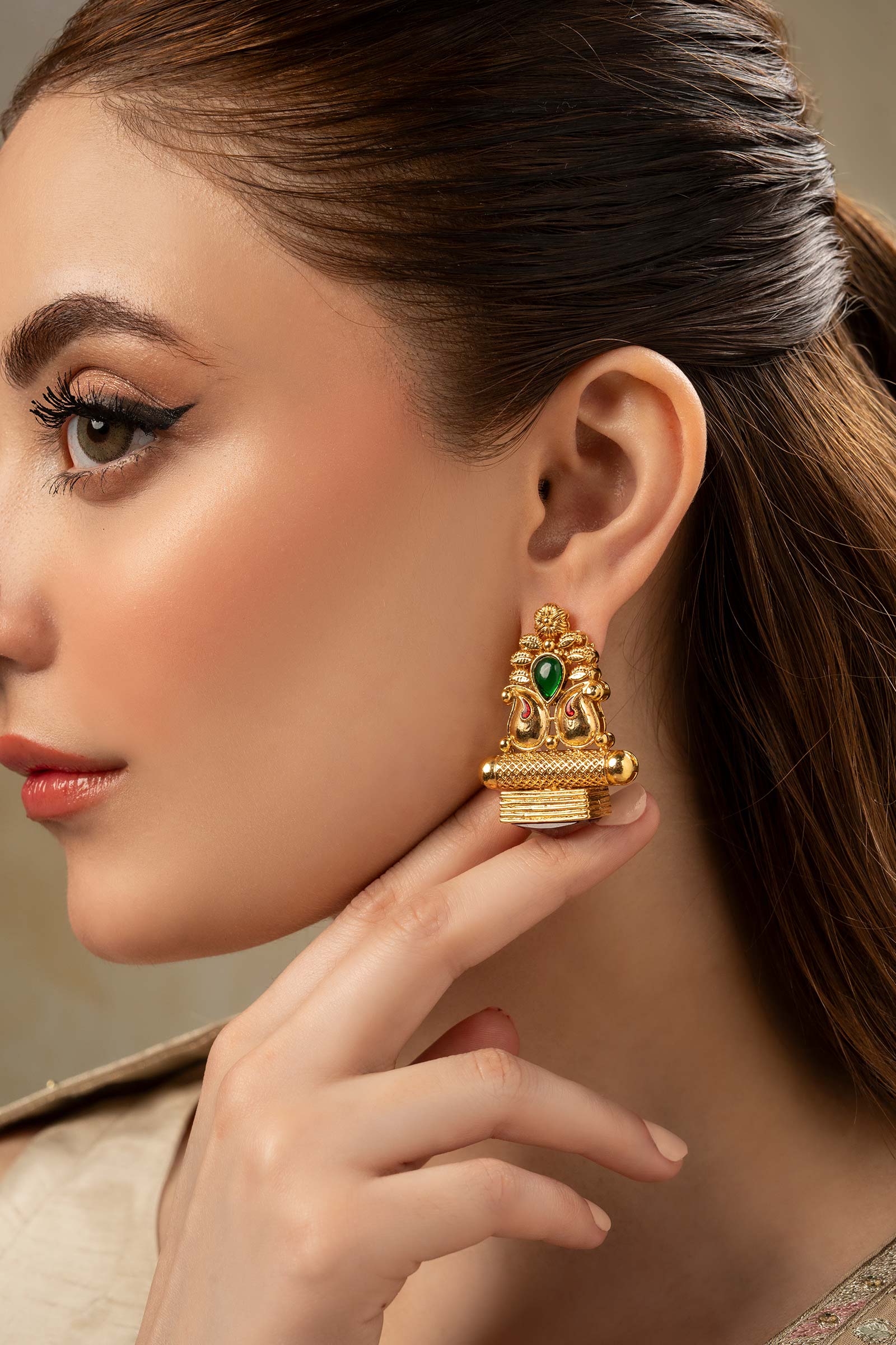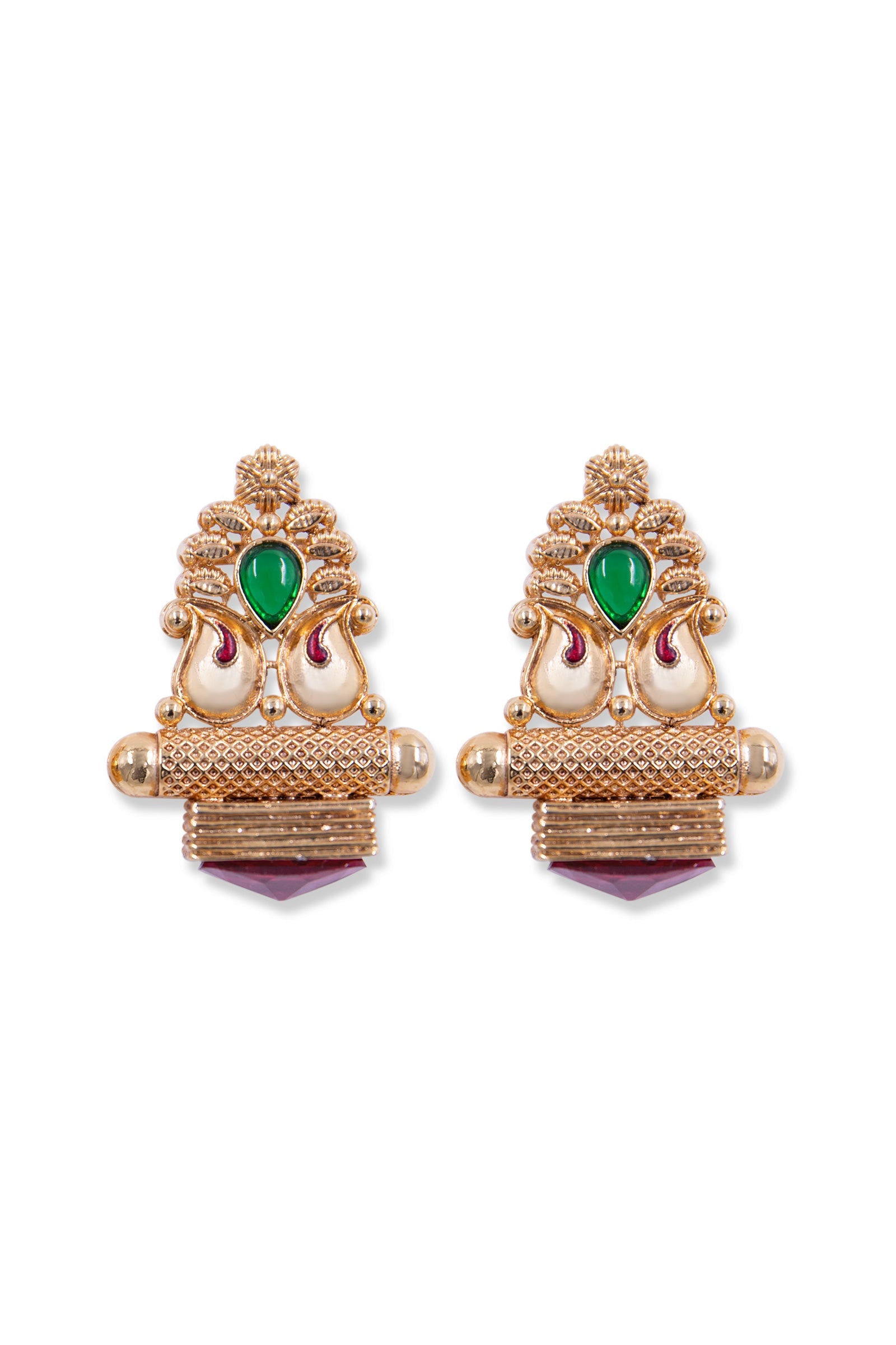 Add a perfect blend of traditional and cultural touch with Egyptian Studs Earrings - Gracefully adorned with green onyx stone in a delicate vintage setting, with a cluster of textures painted in red enamel and finished with a glistening red glass stone, they are an elegant choice for a festive look.