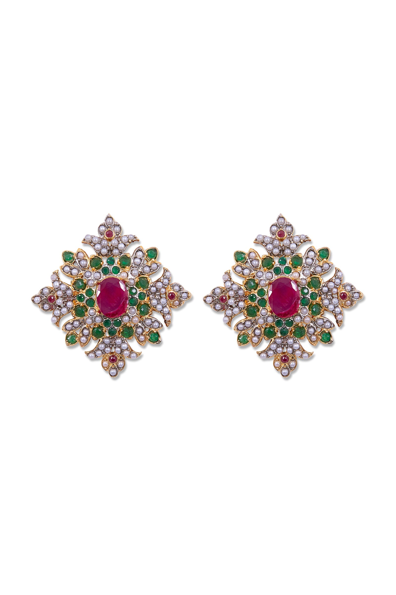 These beautiful Chatham Charm Stud Earrings are a crowning touch for a timeless look! Delicately crafted with pink Chatham stone surrounded by green onyx and pearl beads, making them a perfect match for your formal and glamorous casual look.